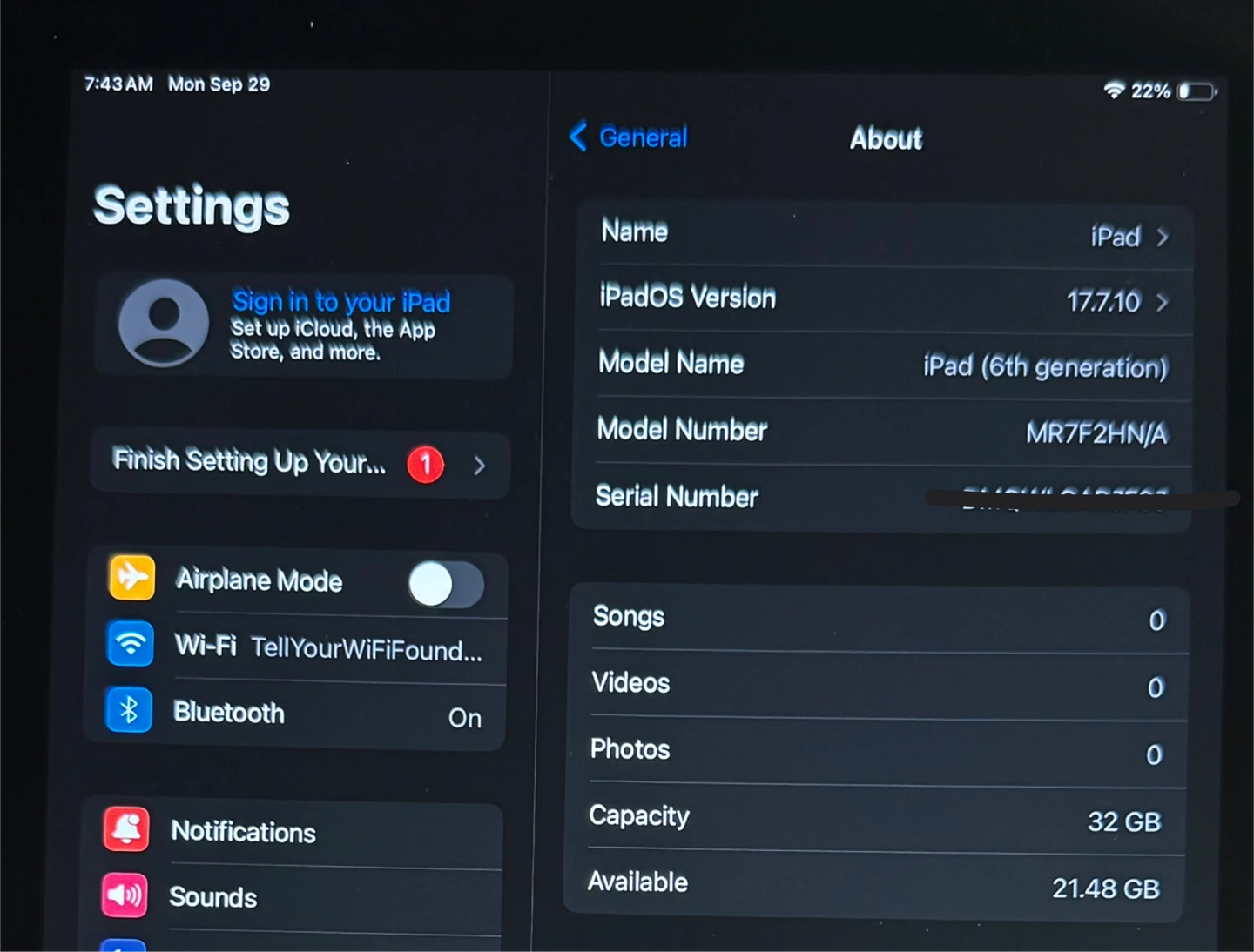 Selling an Apple iPad (6th generation) with 32GB of storage. It's in great shape and ready for a new owner! Model number is MR7F2HN/A.