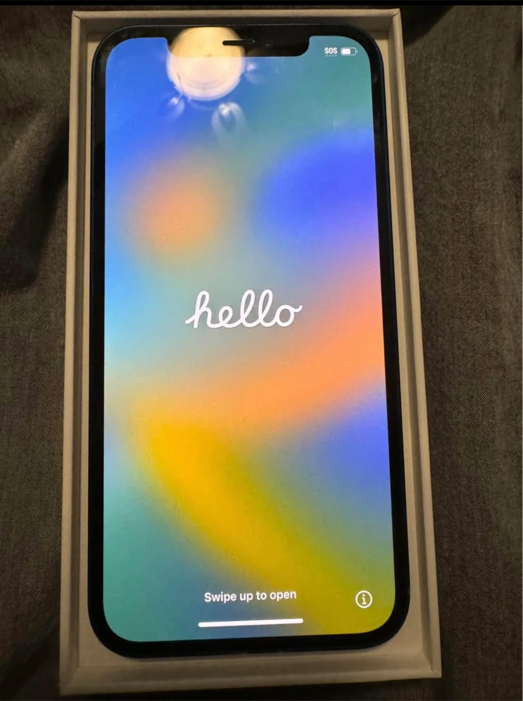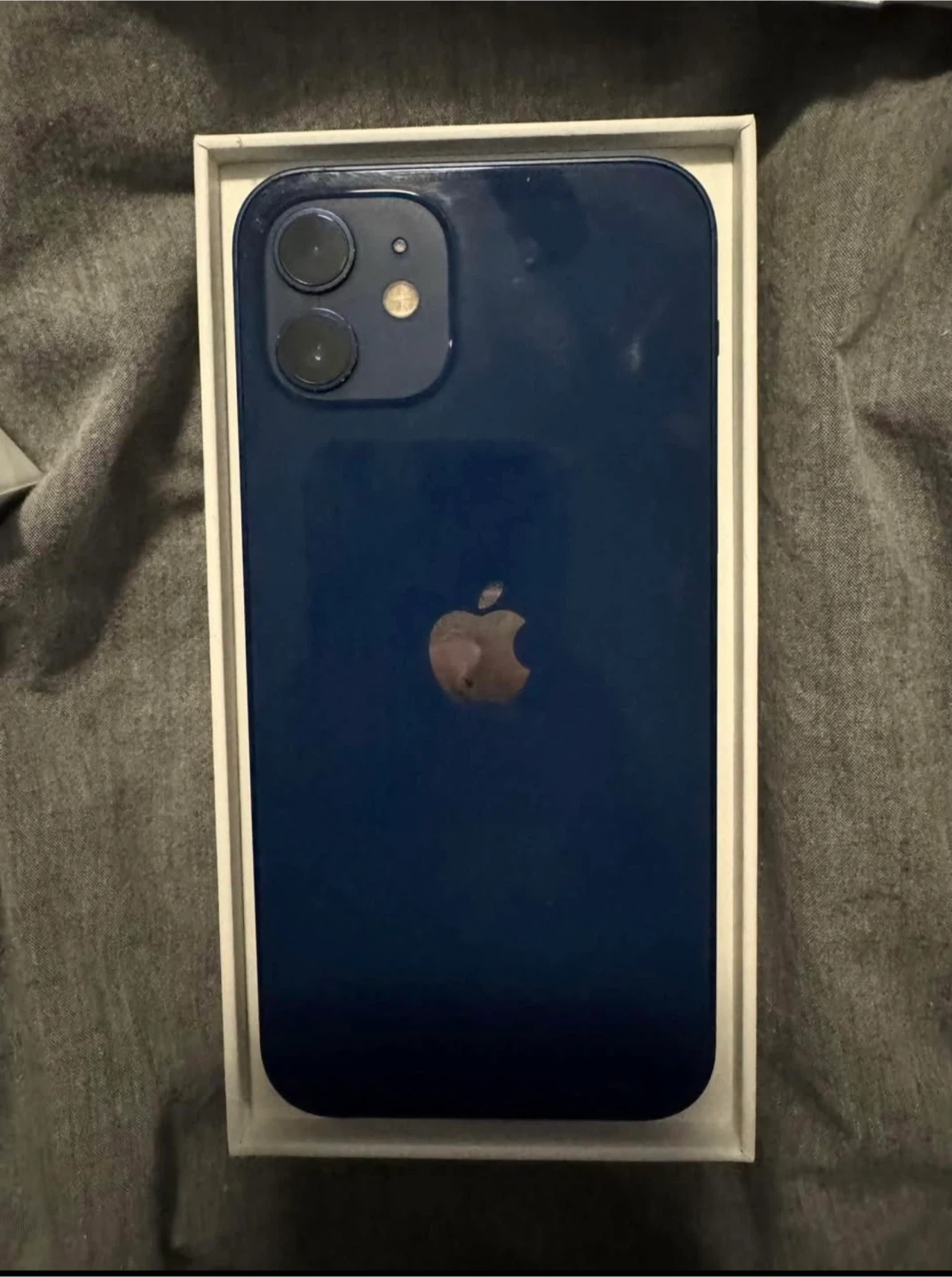 Selling a blue Apple iPhone 12. It comes with its original box. There are some signs of wear and tear on the bottom of the phone. 64 GB