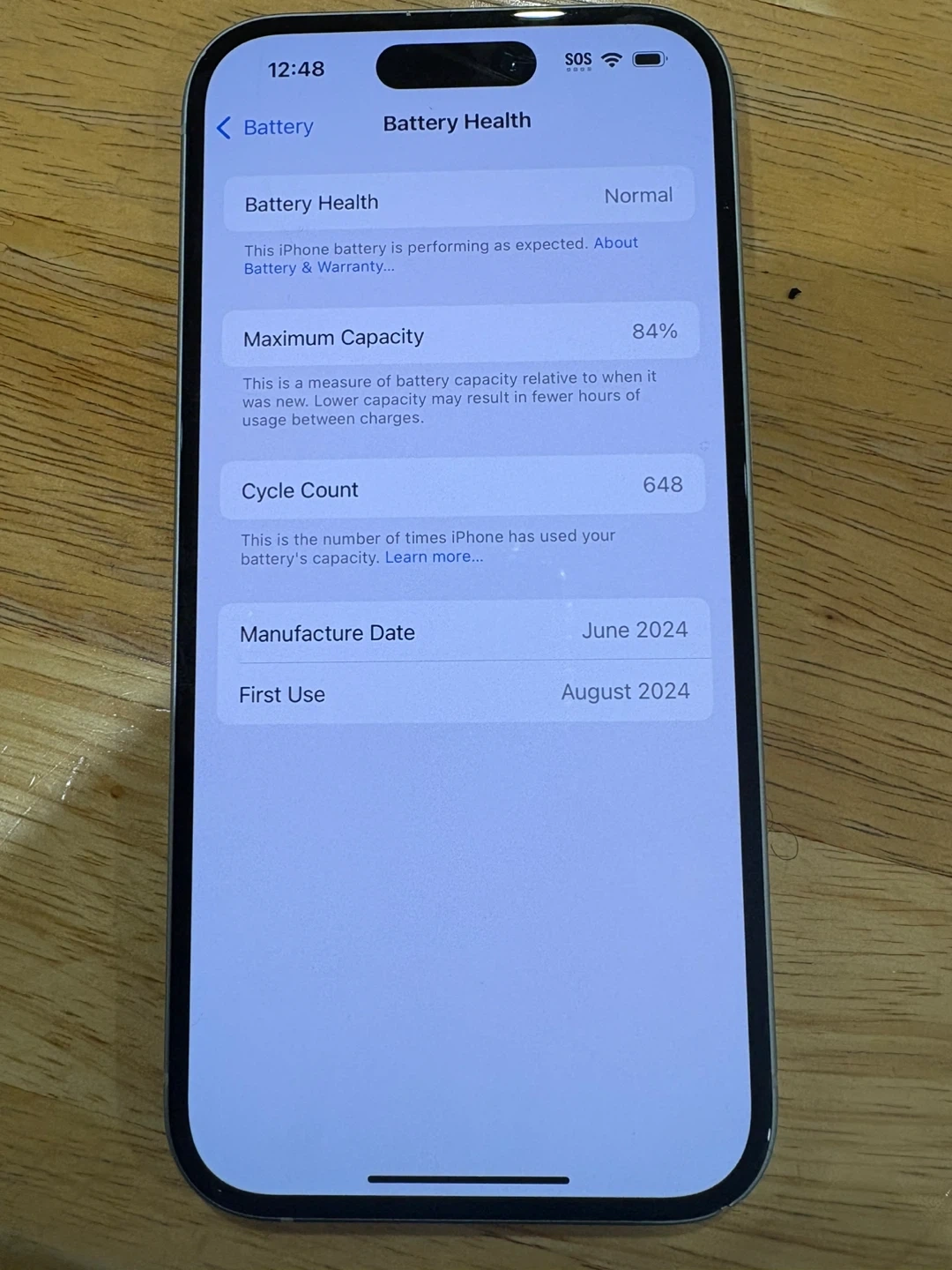 Selling an iPhone 14 in white with 128GB of storage Maximum Battery Capacity: 84% Cycle Count: 648 Manufacture Date: June 2024 First Use: August 2024