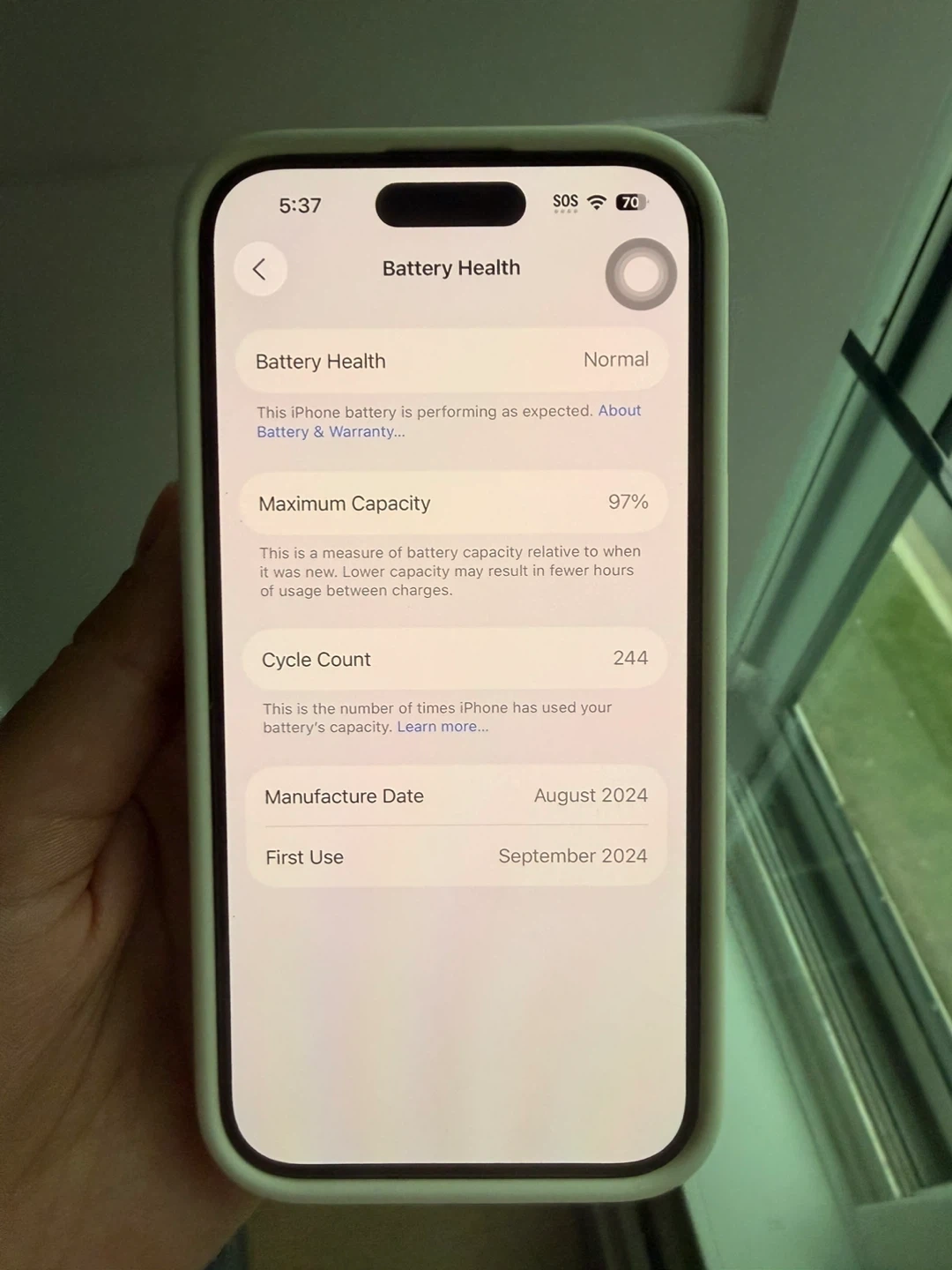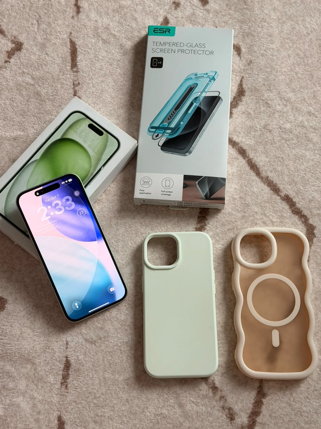 Selling an iPhone 15 in green! It's in great condition and comes with a screen protector, two cases and original box with cable. Used it as a second phone, so the battery health is excellent - 97%