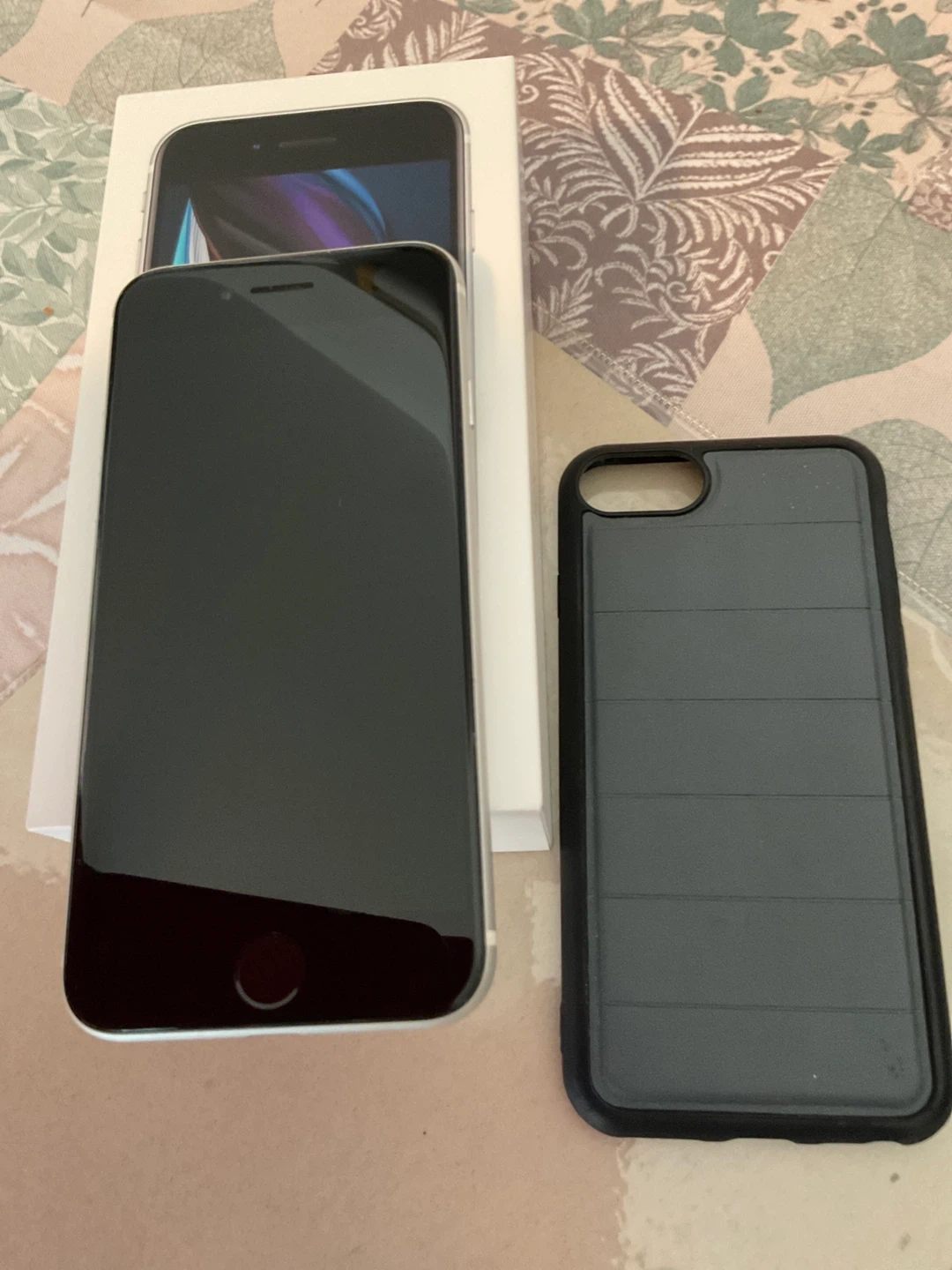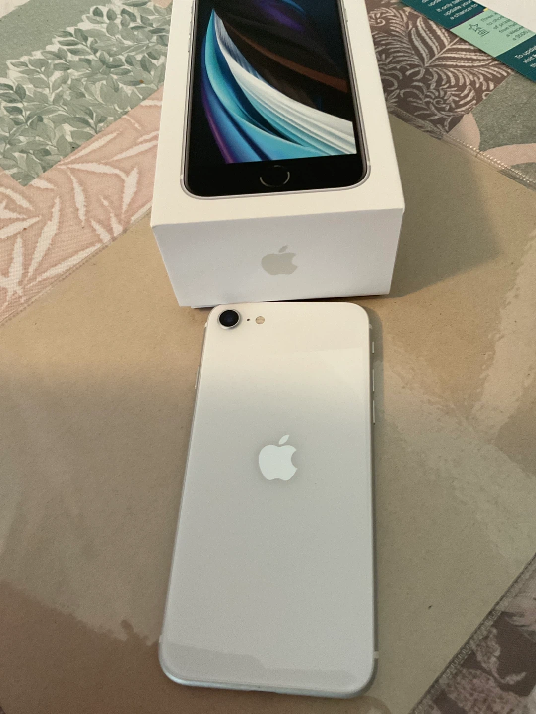 Selling a white iPhone SE (2nd generation). It comes with the original box and a phone case. The phone is in great condition and ready for a new owner!