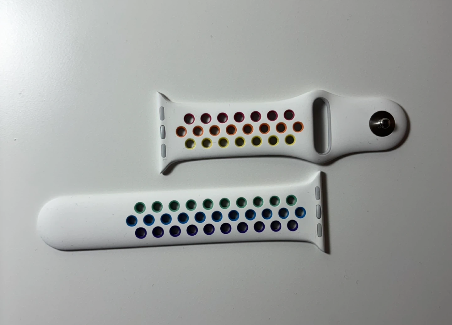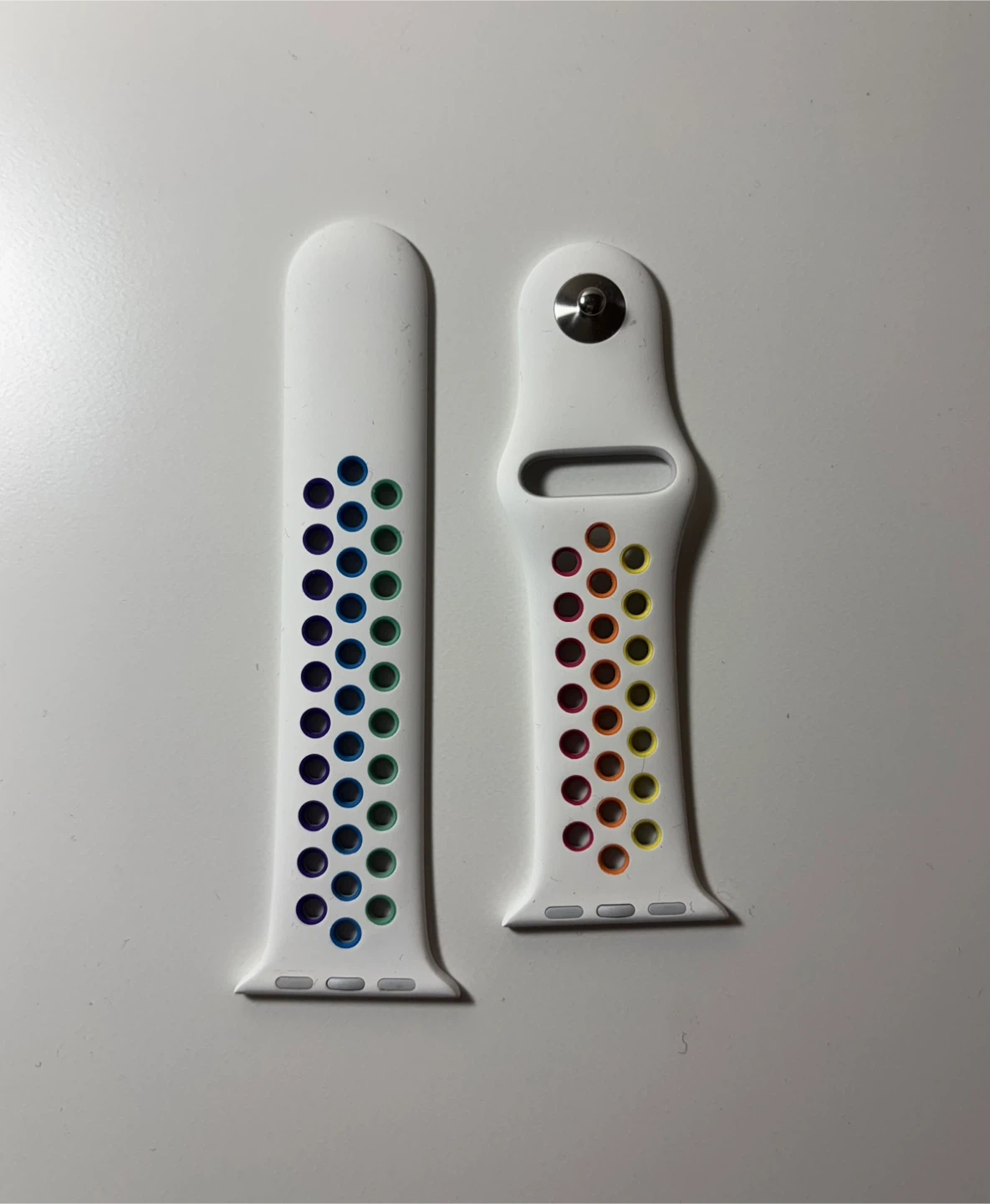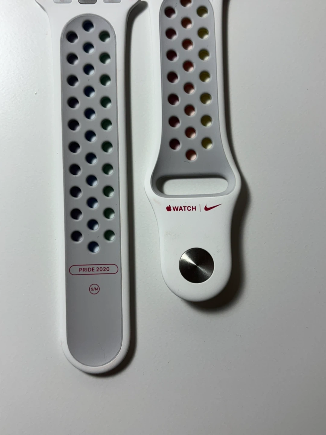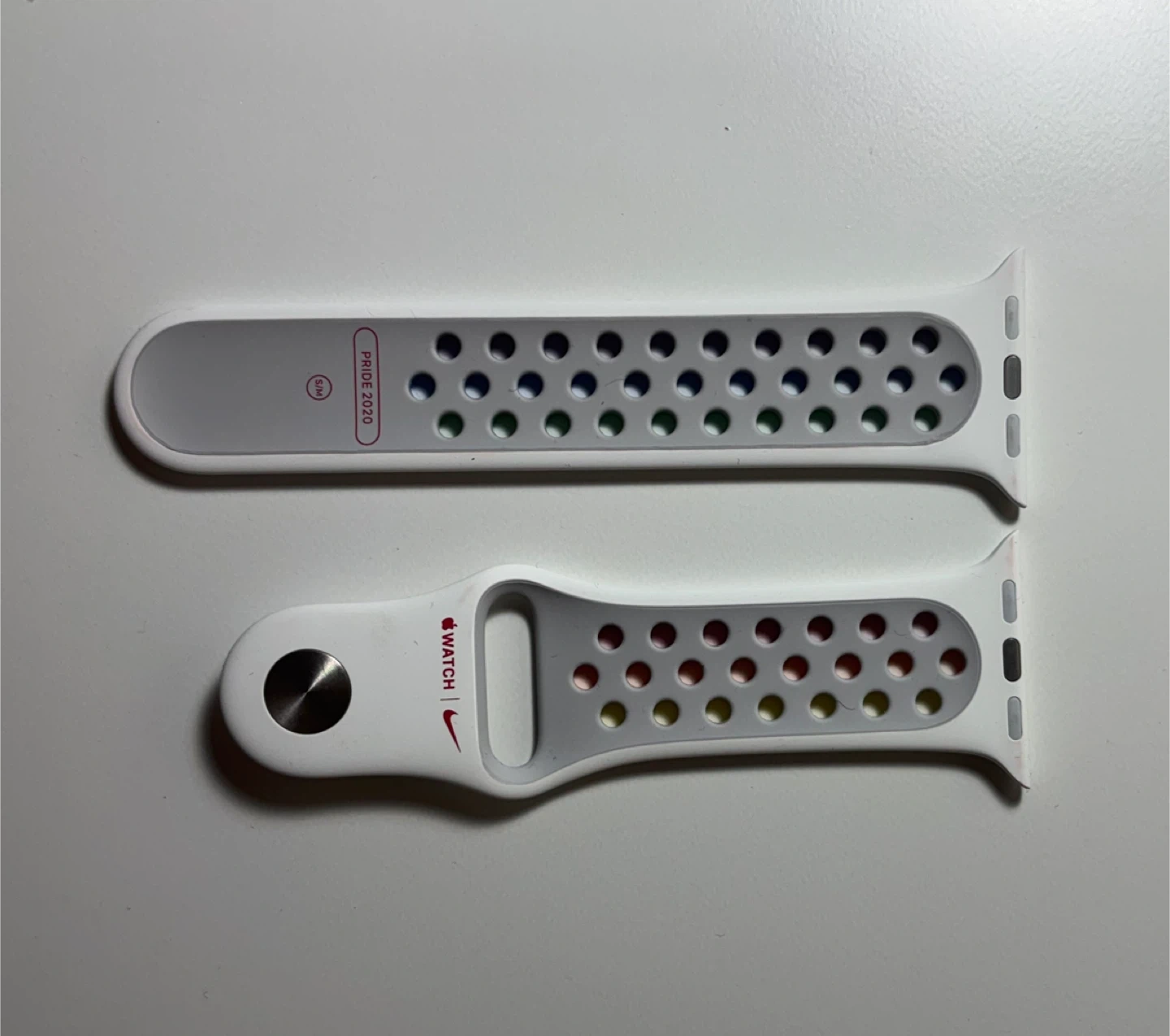 Selling an Apple Watch Nike Pride Edition band in size S/M (from Apple Store). It's in perfect condition and features the iconic Nike design with the Pride colours. From the 2020 collection.