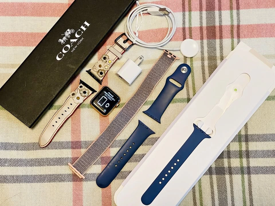 Apple Watch Series 3: Rose Gold, GPS + Cellular, 38mm. Note: There are some wear and tear scratches on watch face but function is still working perfect. Accessories package includes: 1. Apple Sport Loop Band 2. Apple Sport Band 3. Coach leather band 4. Magnetic USB Charger 5. USB power adapter Pick up in Vancouver, near Dunbar Community Centre.