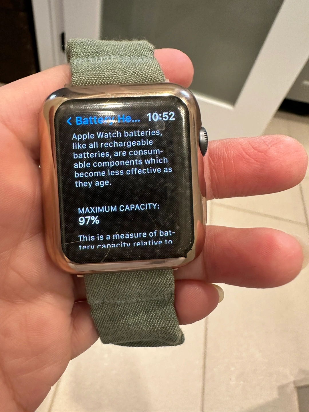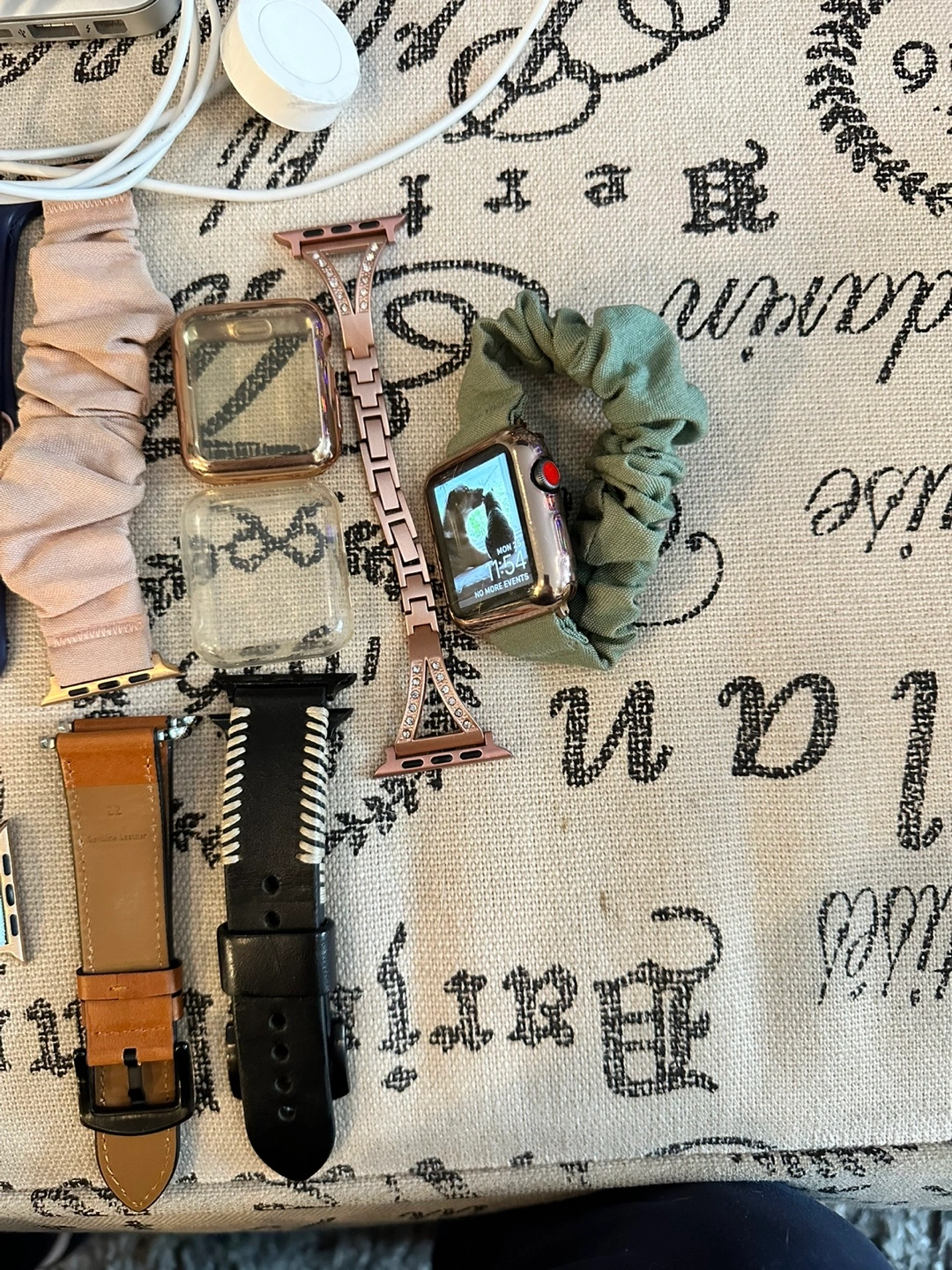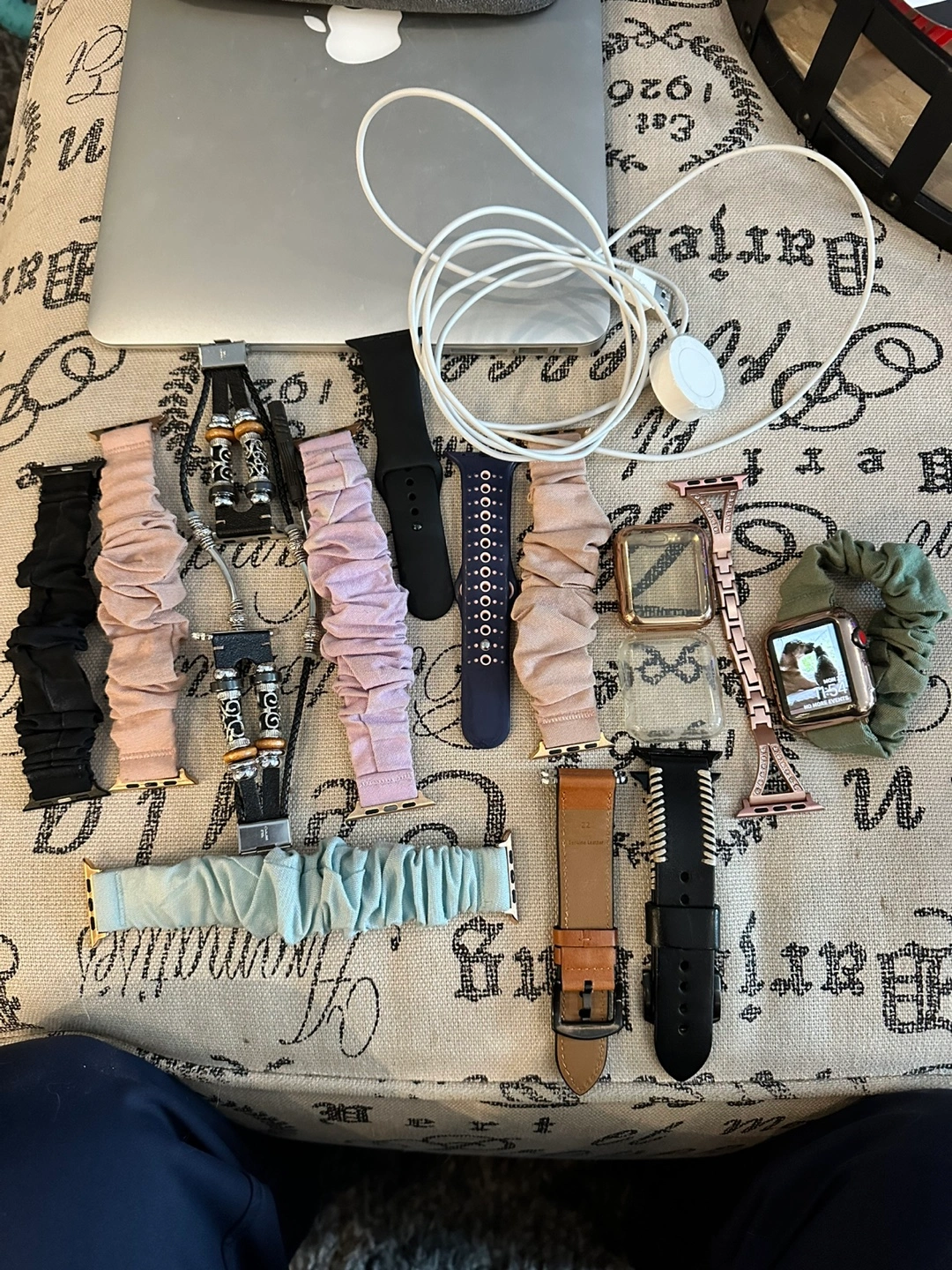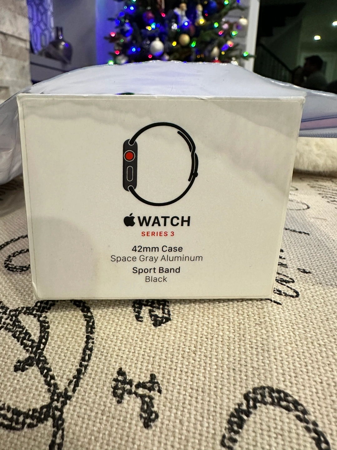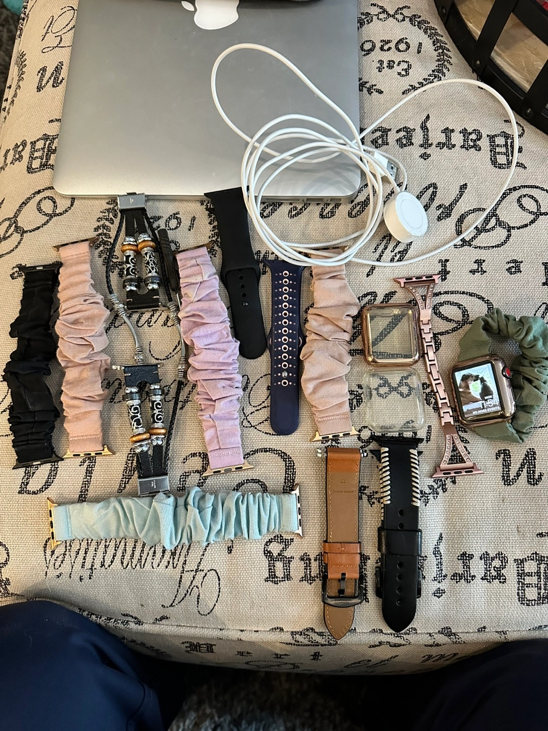 Selling an Apple Watch Series 3 with a 42mm Space Gray Aluminum case and a black sport band. It comes with a variety of watch bands, including scrunchie-style bands and others. The original box is included, along with the charger. The battery is 90%. The condition is excellent!! I upgraded to a newer series so selling this one.