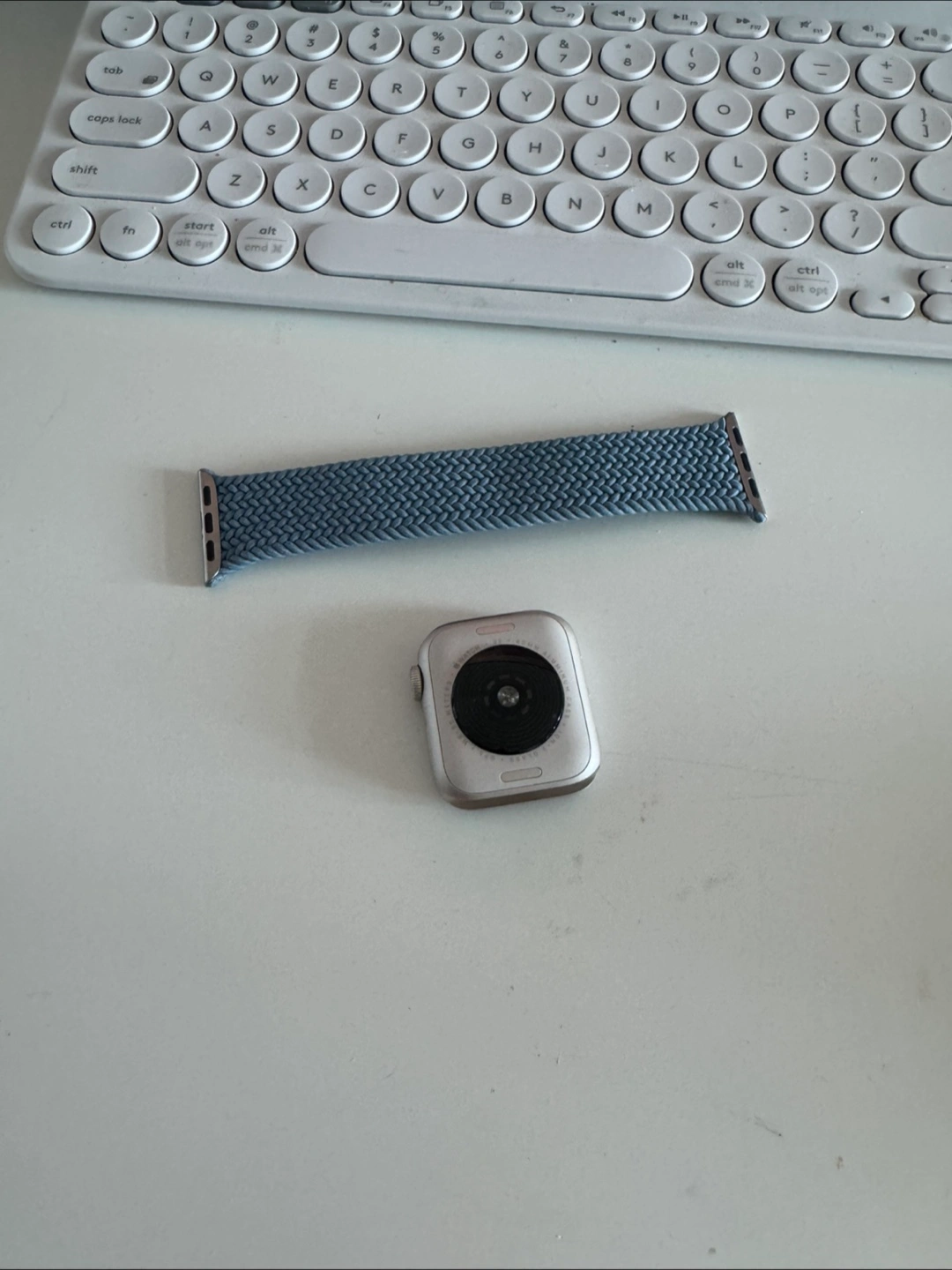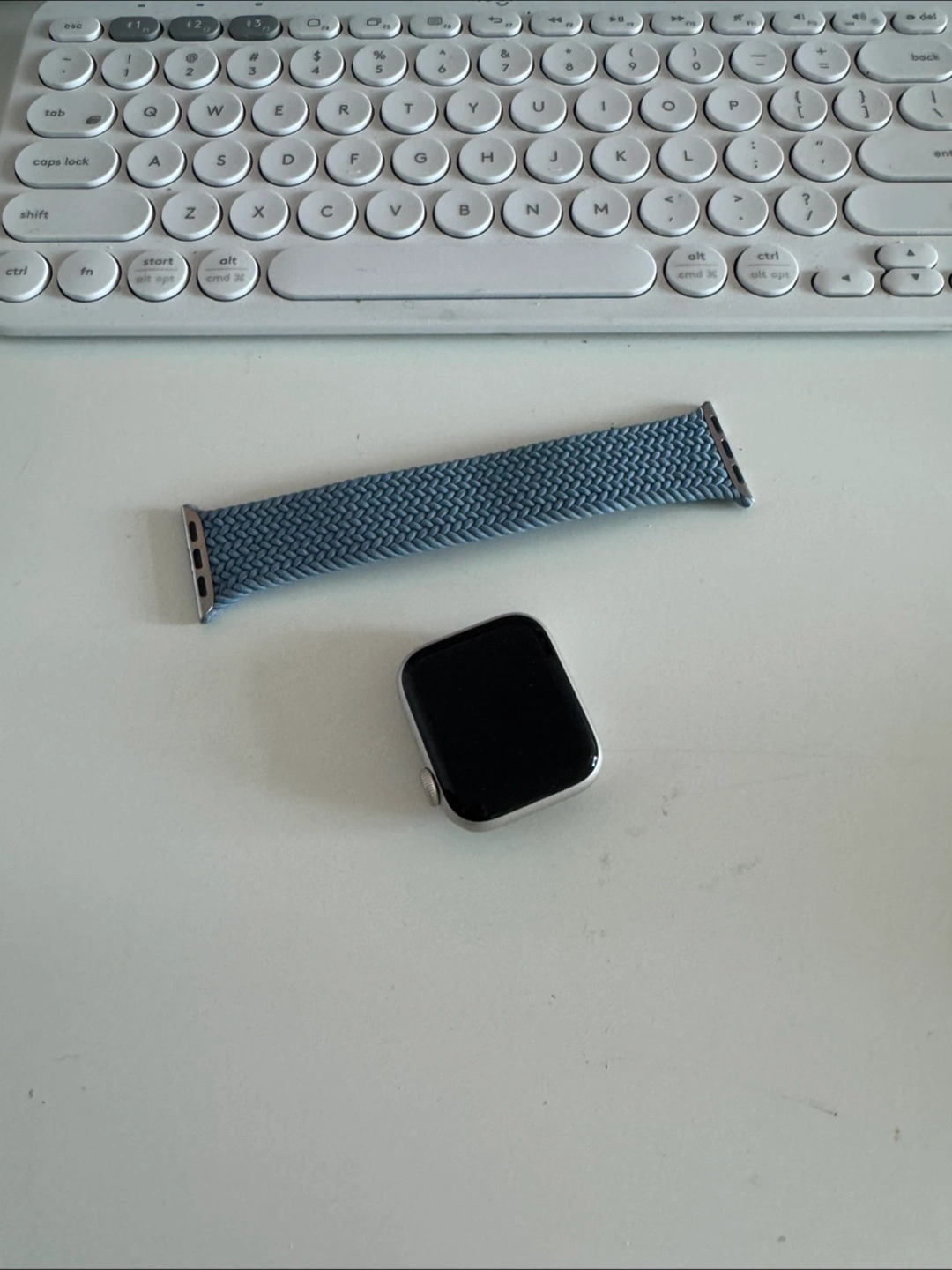 Silver aluminum Apple Watch Series 4. Comes with a blue apple band. Pre-owned.