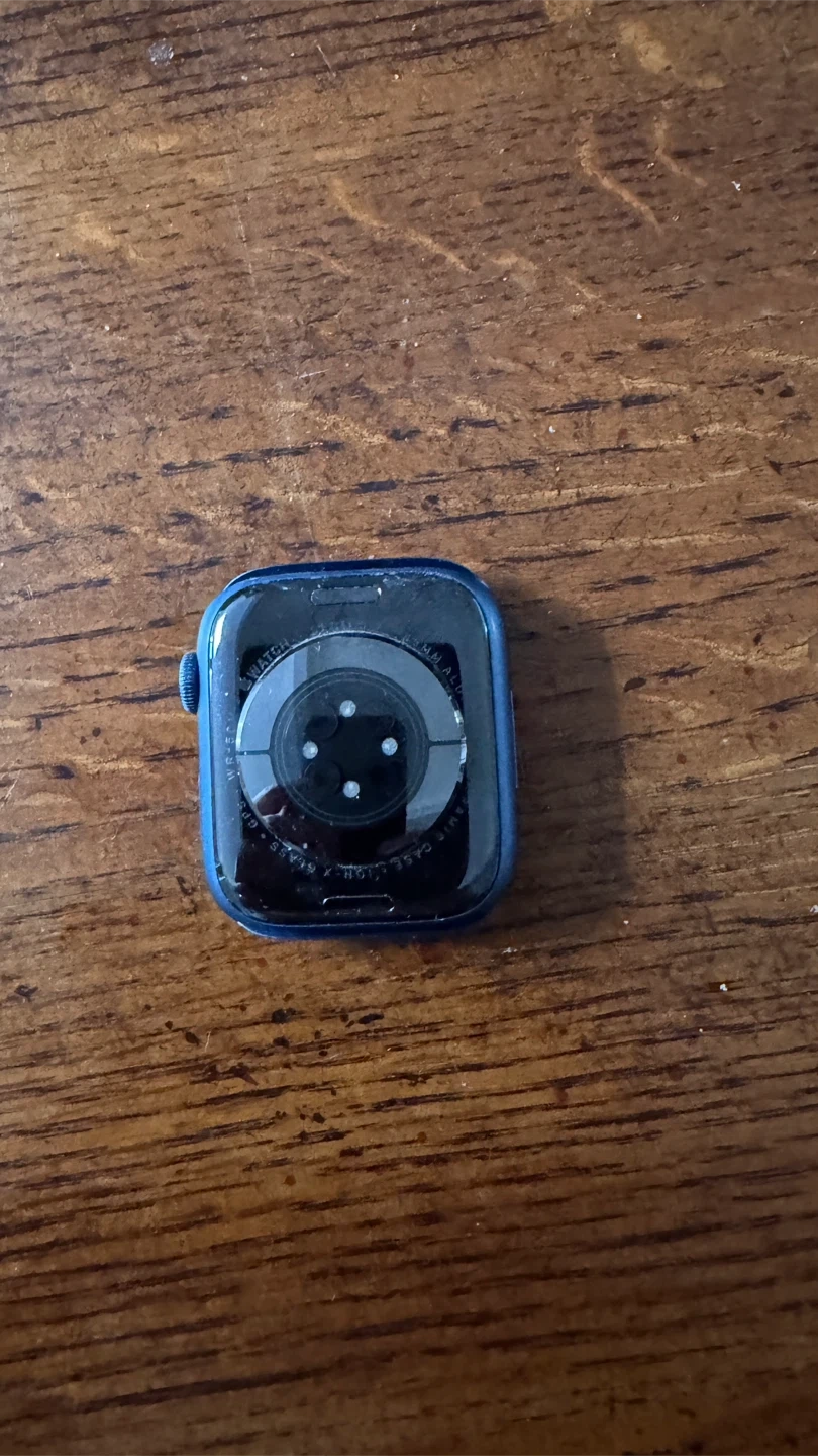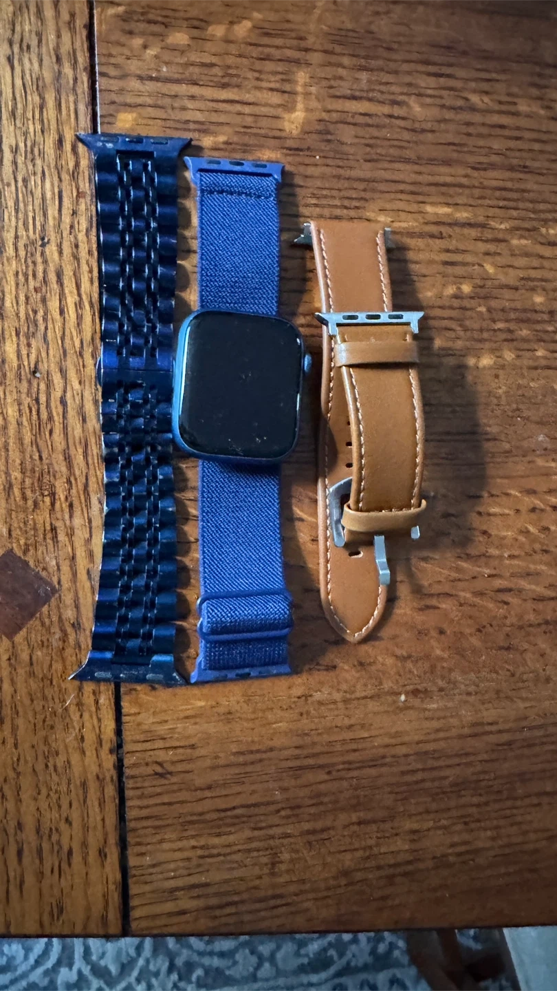 Selling an Apple Watch Series 7 in blue. It comes with three different bands, including a blue sports band, a metal link band, and a leather band. Great condition!