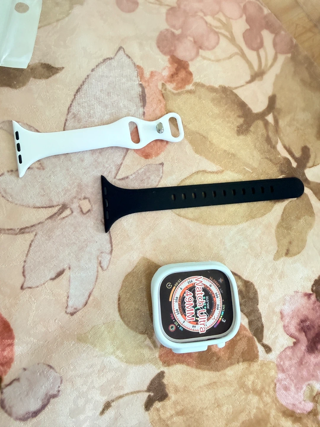 Apple Watch Ultra 49mm BAND and CASE. The case is white, and the band is black and white.