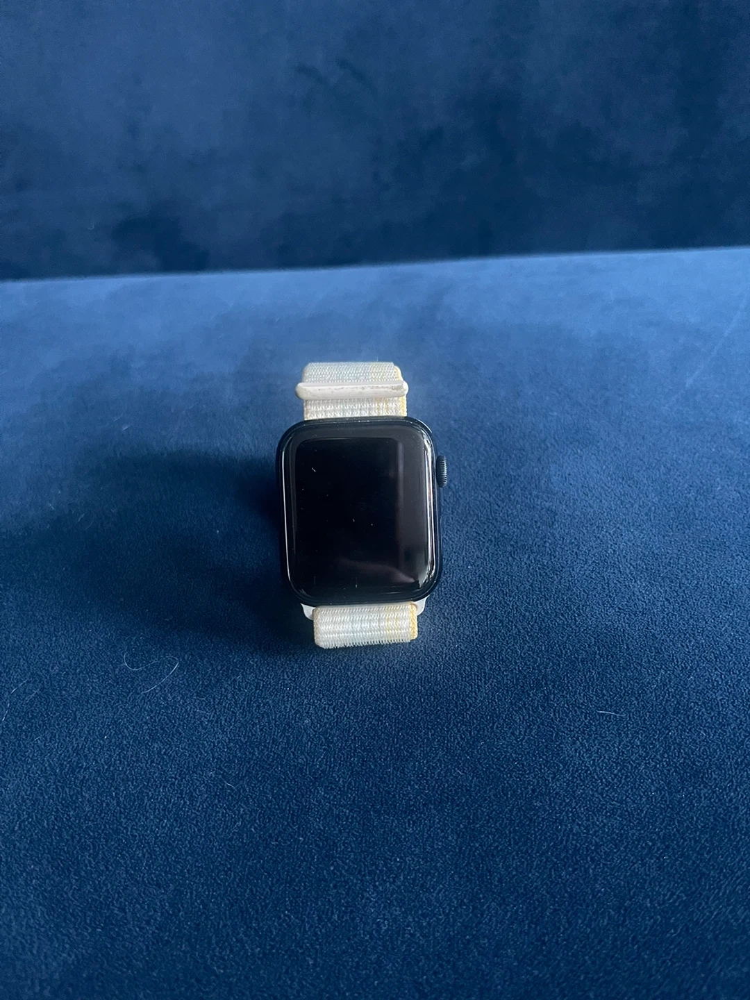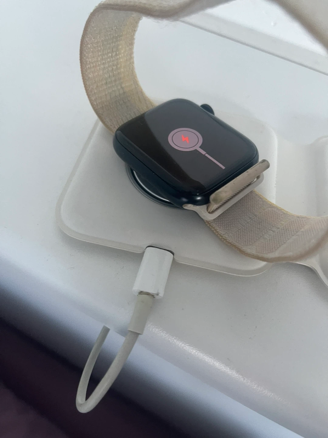 Selling an Apple Watch with a cream-coloured band. It's in great condition and ready for a new wrist! Lost the original charger.
