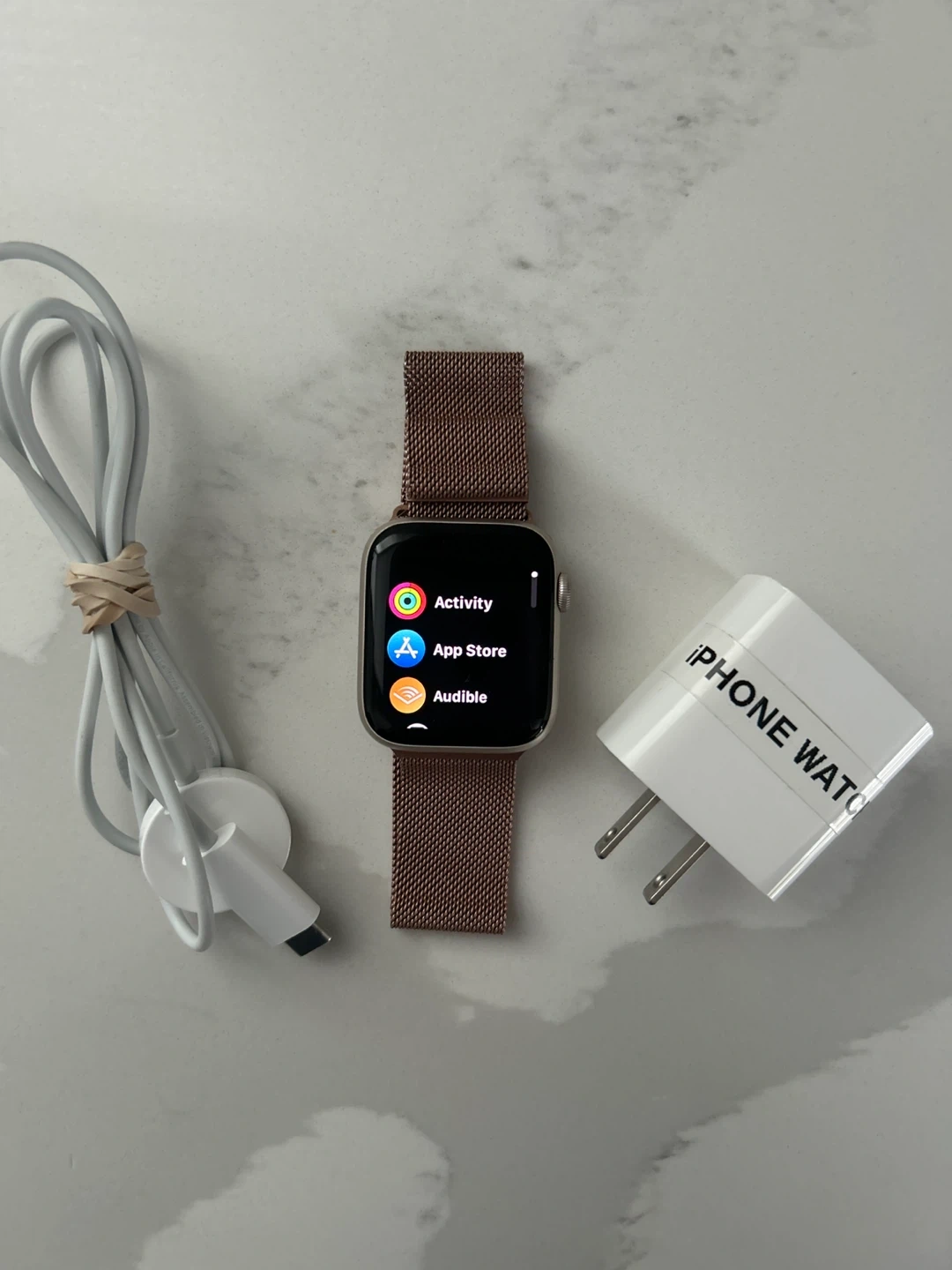 Selling an Apple Watch Rose Gold strap with a Milanese Loop. It comes with the charger! Pick up TODAY or TONIGHT for a discount on the price. Otherwise, the price stays as is and is FIRM