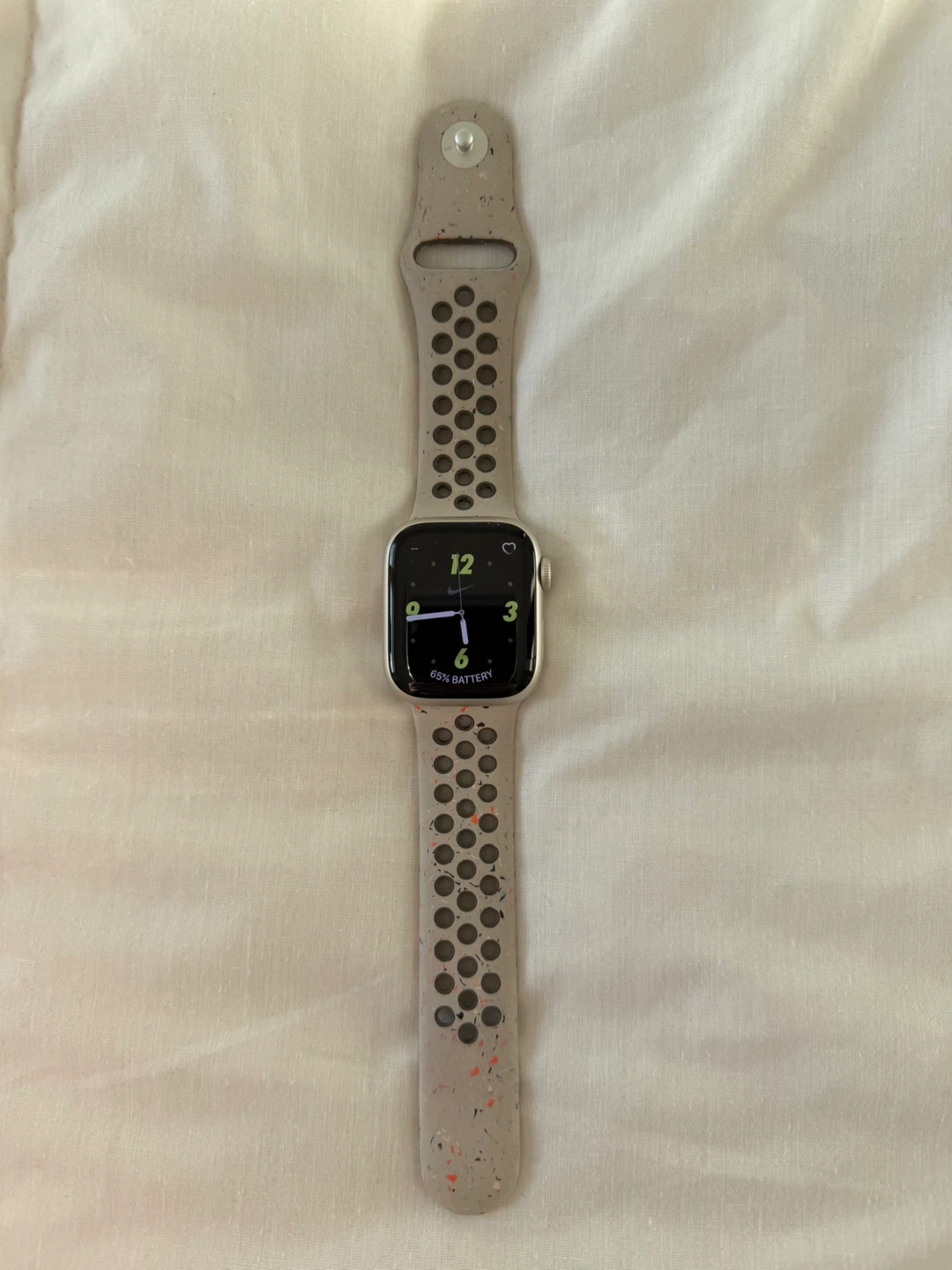 Selling an Apple Watch paired with a Nike Sport Band! The band has a unique design with holes for breathability and comfort. The watch face is in great condition and ready for a new owner