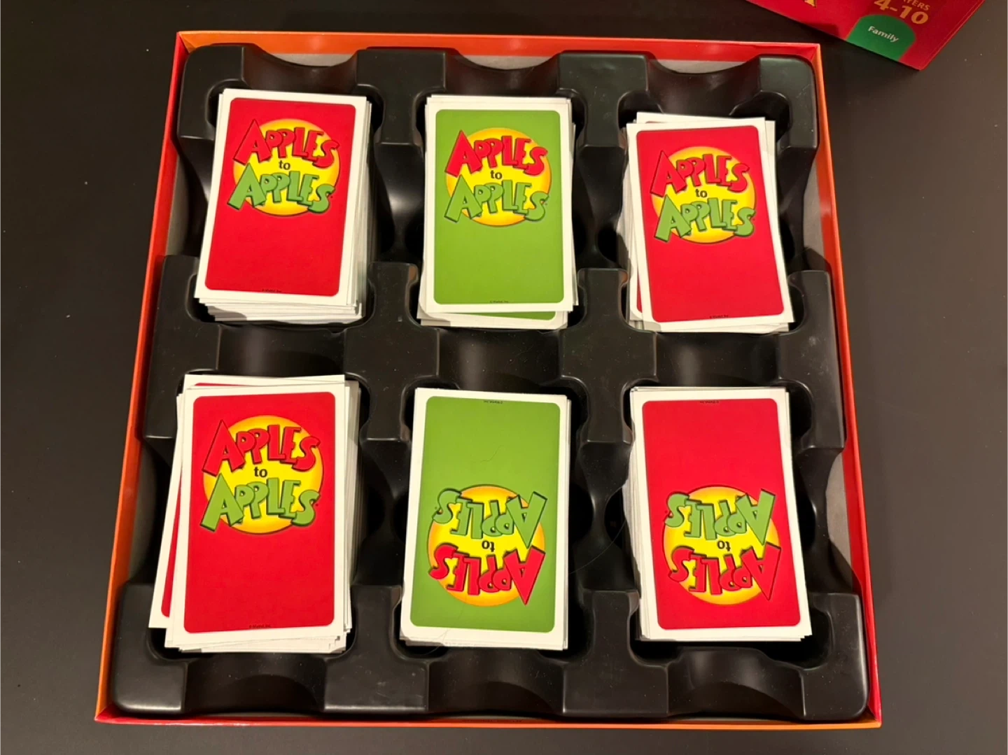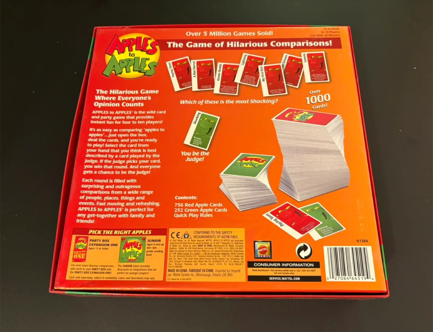 Apples to Apples is the wild card game of hilarious comparisons where everyone's opinion counts! It's easy as comparing apples to apples, just open the box, deal the cards and you're ready to play.