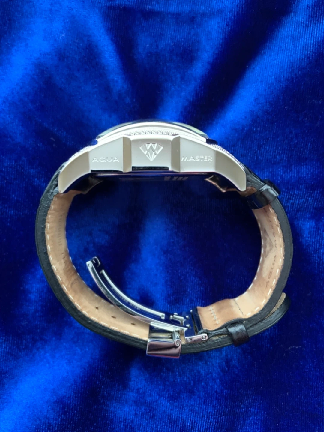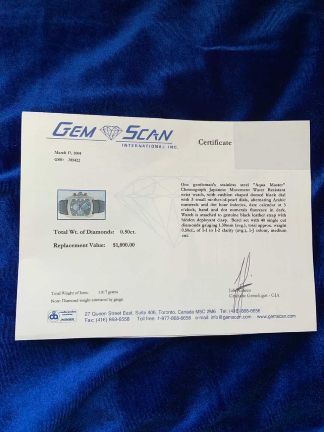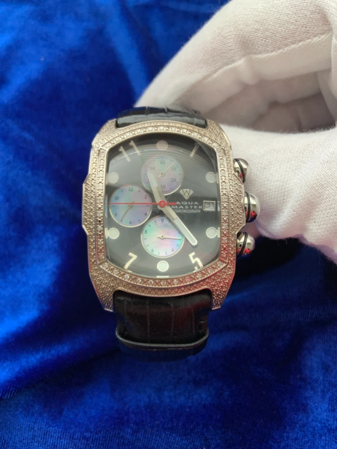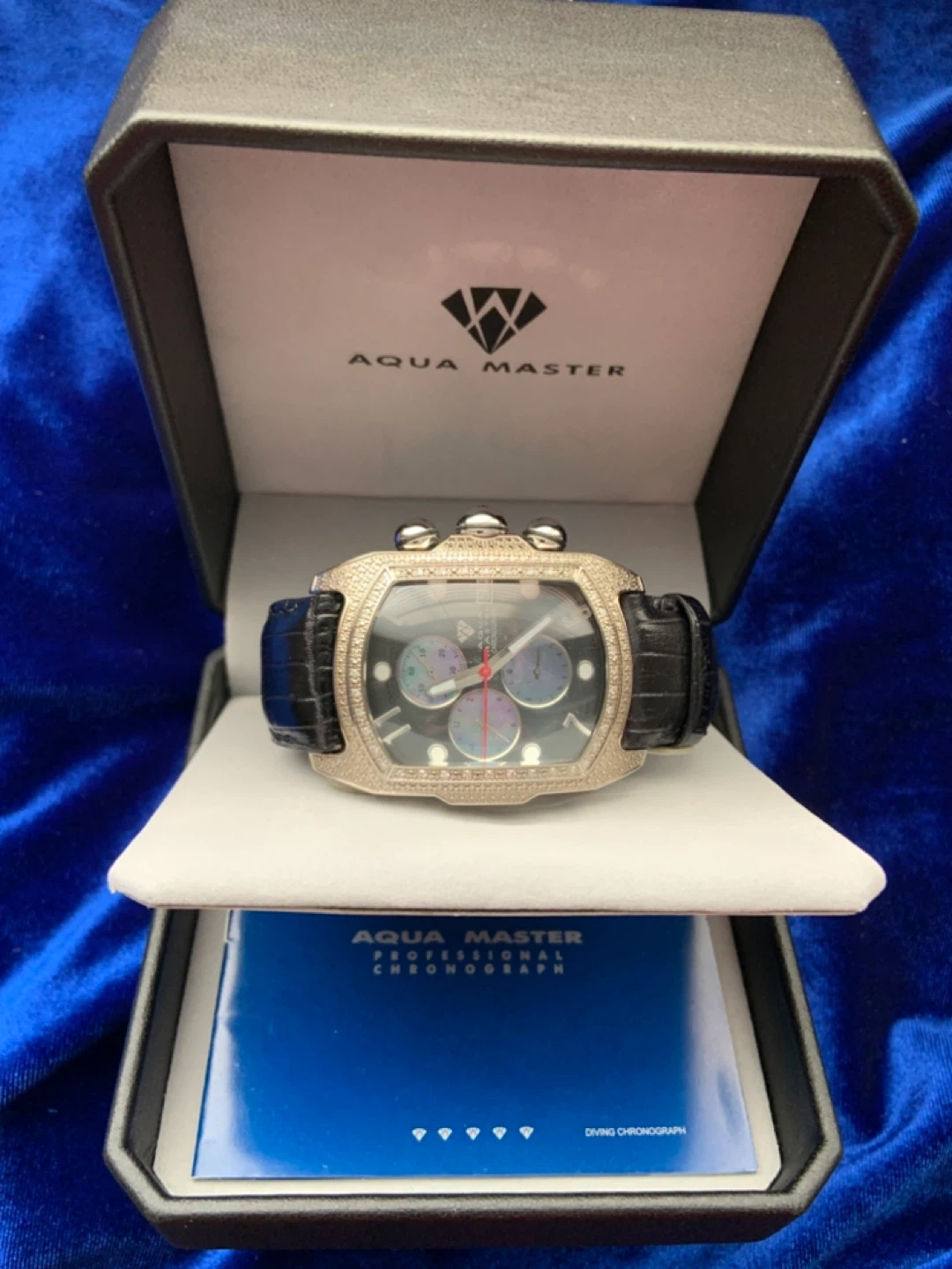 Selling an Aqua Master Diamond Bezel Professional Chronograph Men’s watch. Comes with the original box. The watch is in like new condition and has never been worn, was in secure storage after purchasing from an auction, and just needs a new battery. Original appraisal shown in pictures of $1,800 dollars; but now valued at about $2,500 dollars. Serious buyer, CASH only final sale, no 100 dollar bills please. Thanks!