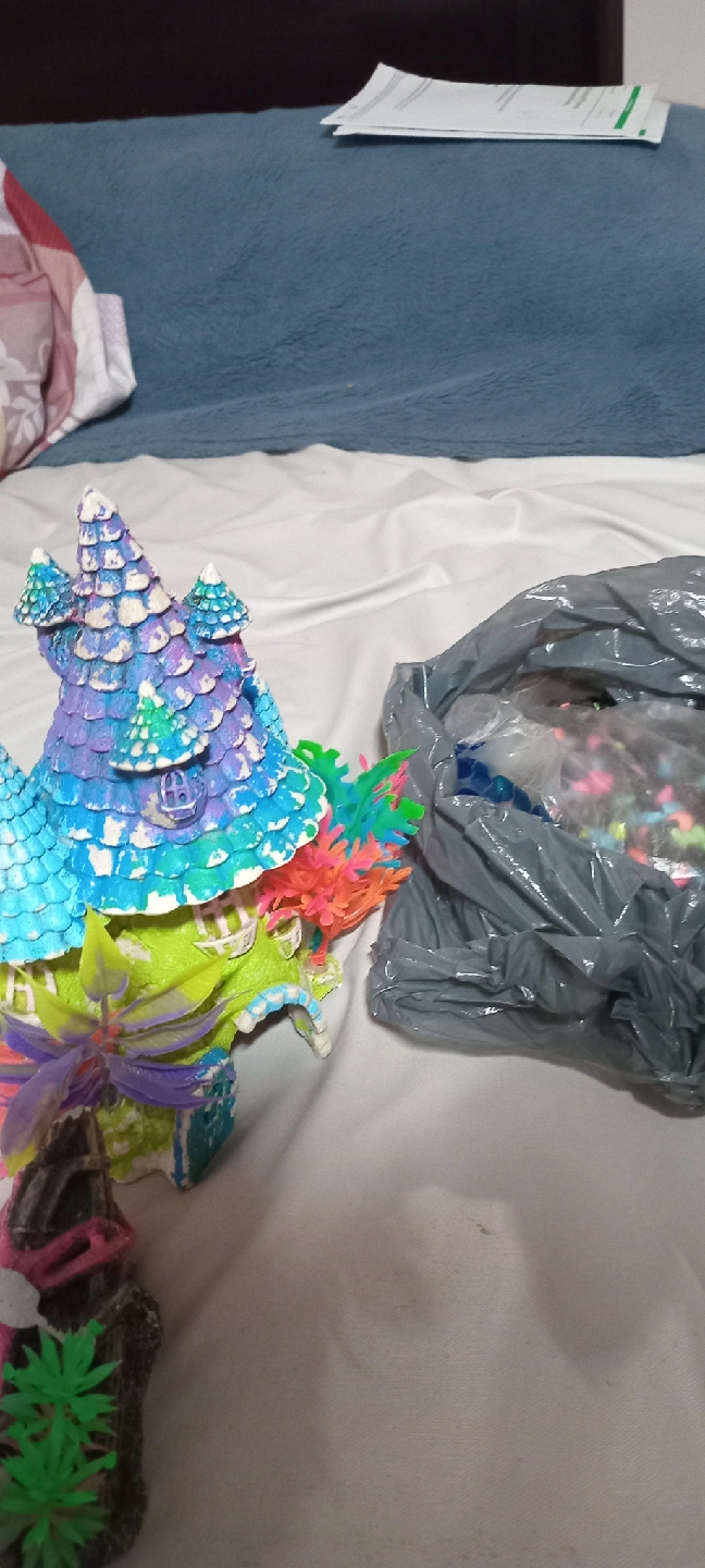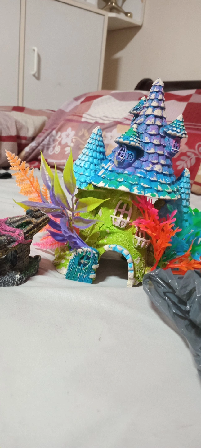 Selling aquarium decor including a colourful castle and a bag of gravel! The castle is a fun addition to any tank, and the gravel is perfect for creating a natural-looking environment for your fish