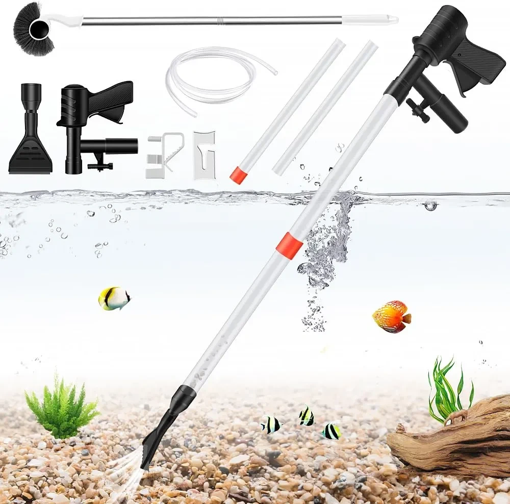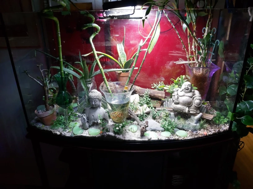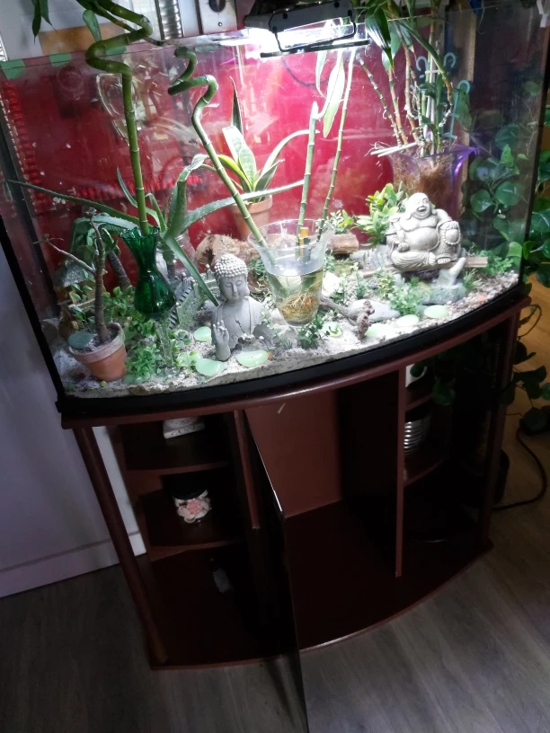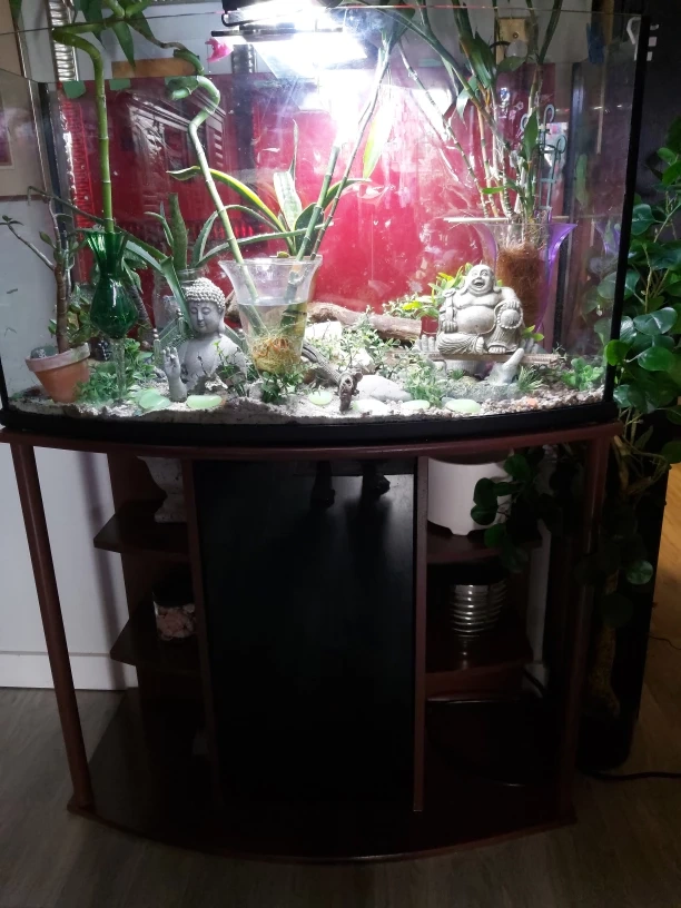 Selling a 49g bow front acquarium with stand and a collection of aquarium accessories to keep your fish happy and healthy! Included: - Fish Tank Filter (for 30-50 gallon tanks) -1 foam filter - Aquarium Gravel Cleaner - box of spare parts, food, water conditioner, decor including live bamboo - LED Light with extendable mounting bracket - Hitaung Aquarium Heater with digital display - Uniclife UL40 Air Pump