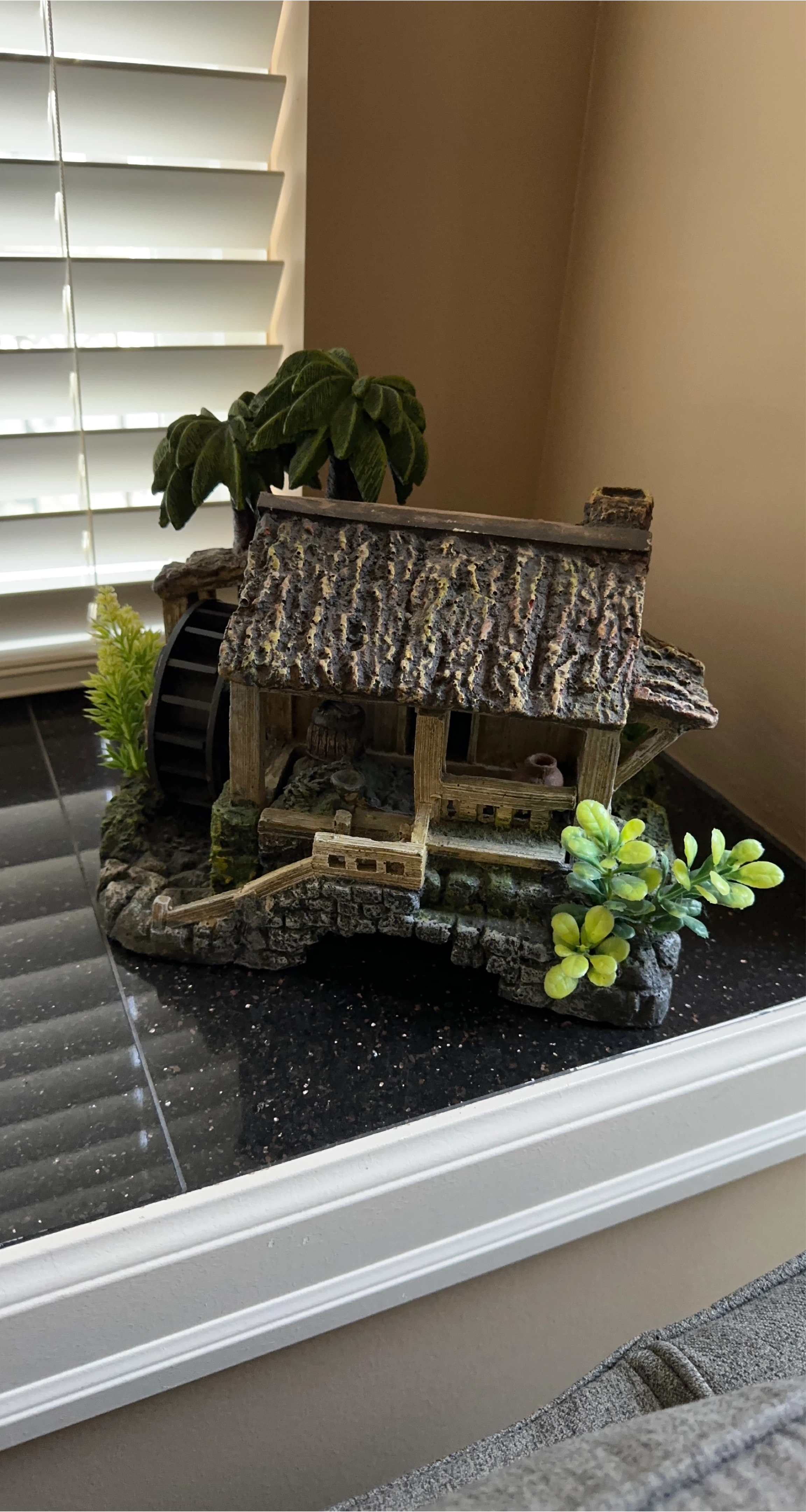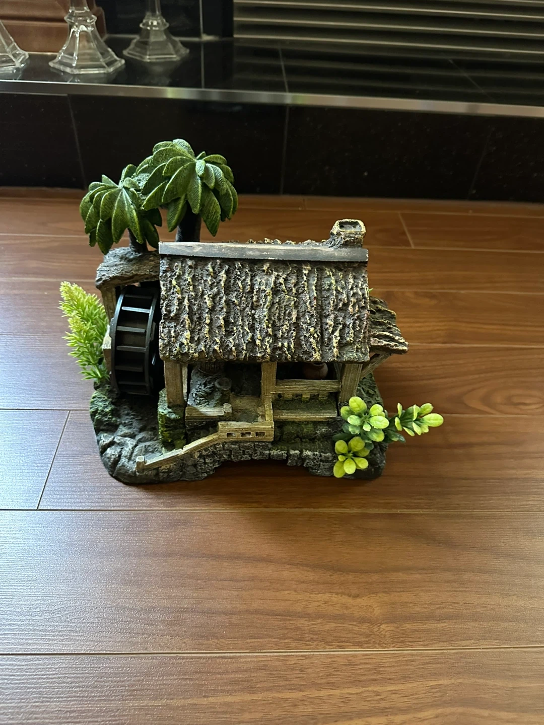 Add a charming touch to your aquarium with this water mill house ornament! It's in great shape and ready to provide a cozy little landscape for your fishy friends. It's a cute little house with greenery and a water wheel, perfect for creating a whimsical underwater scene