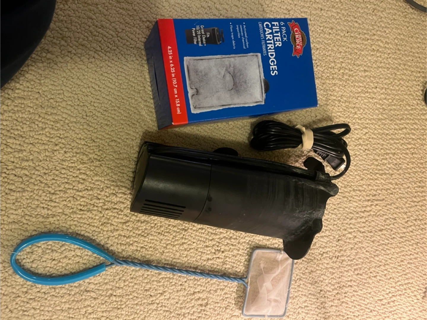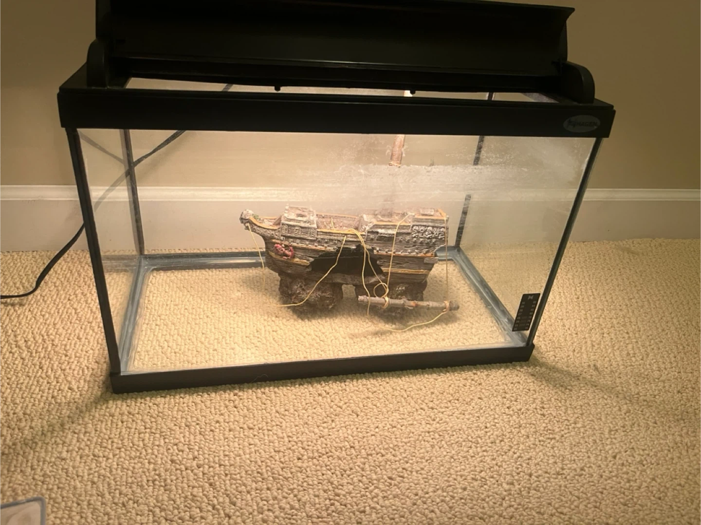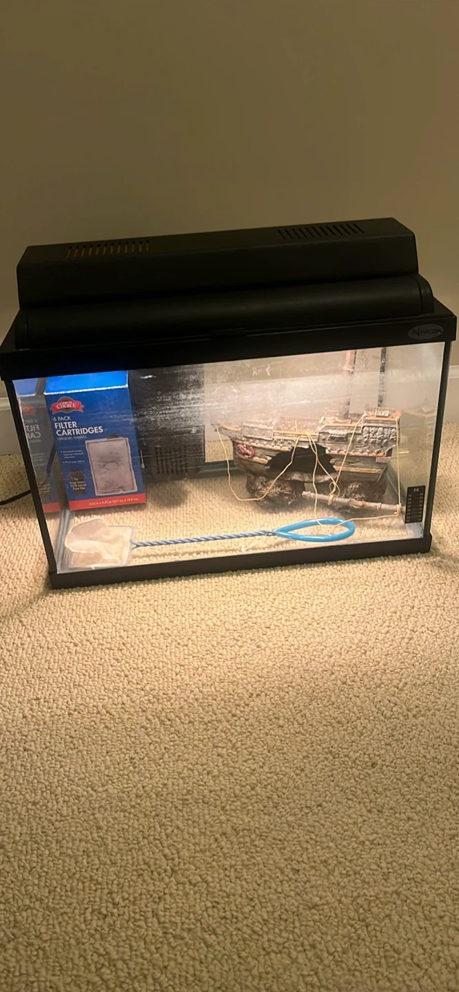 Selling a used aquarium tank that comes with a few accessories. It includes a filter with 2 filters, net, and a pirate ship! Great for setting up a small fish habitat!