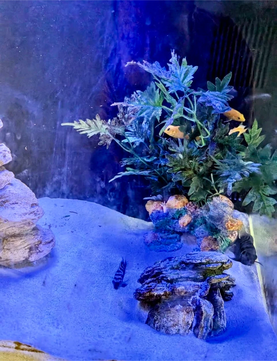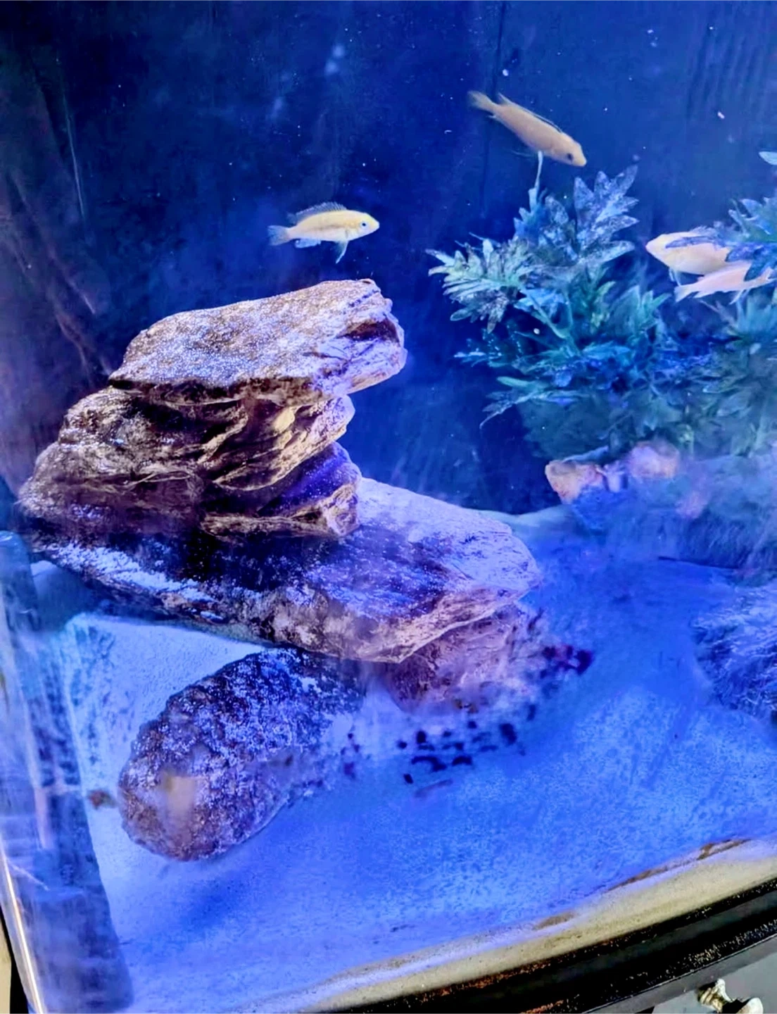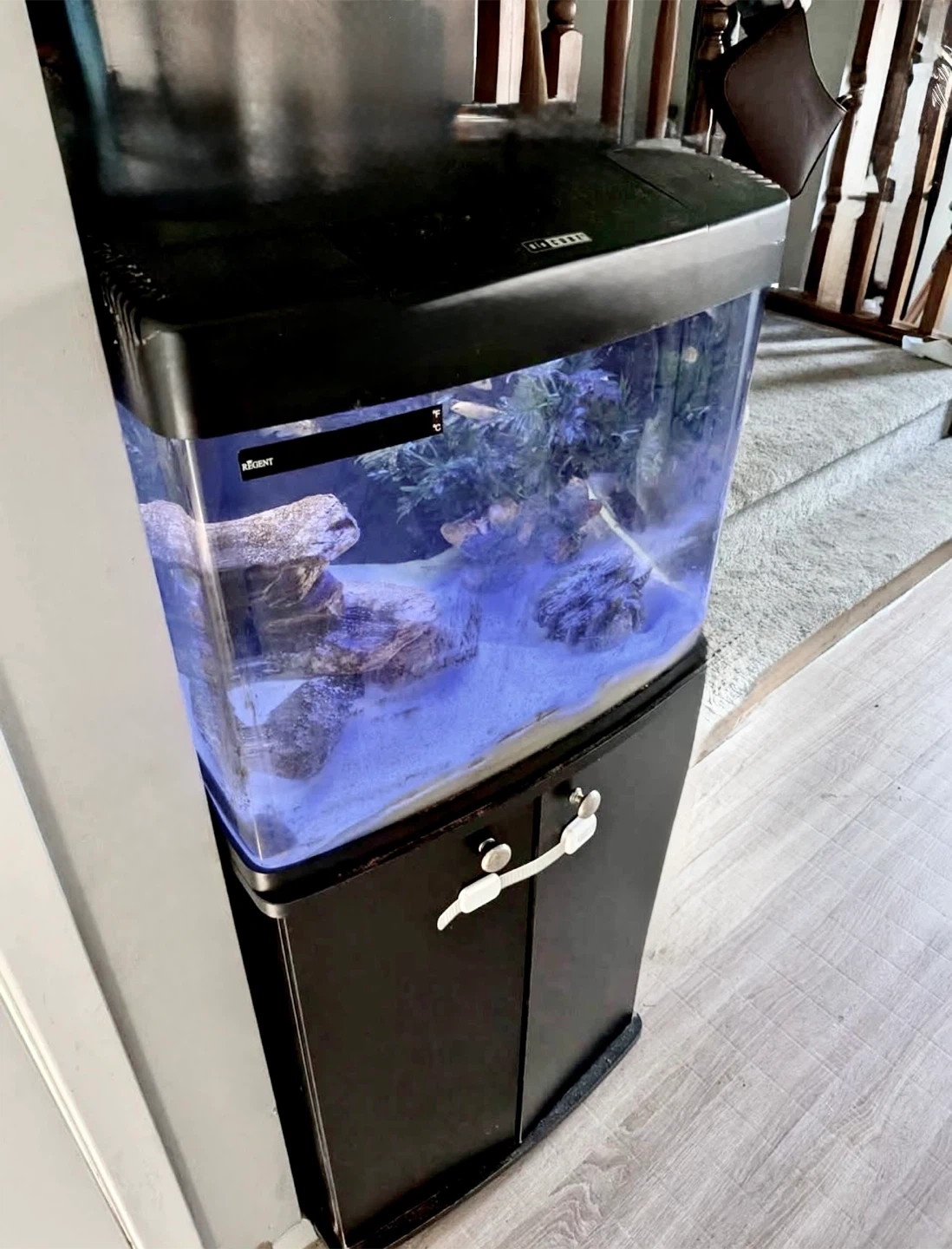 32” Gallons, 24"x22x19" Blocube Aquarium, Comes with table, it has its own filtration system on it, so no need for filtration. Bio cube is the strongest aquarium, it has no corners makes it beautiful view. Everything in the picture will be included. Sand Heater Air Motor Stone Air Pressure Rocks Malavi Sand Filters Fish catcher Led Lights Everything you see