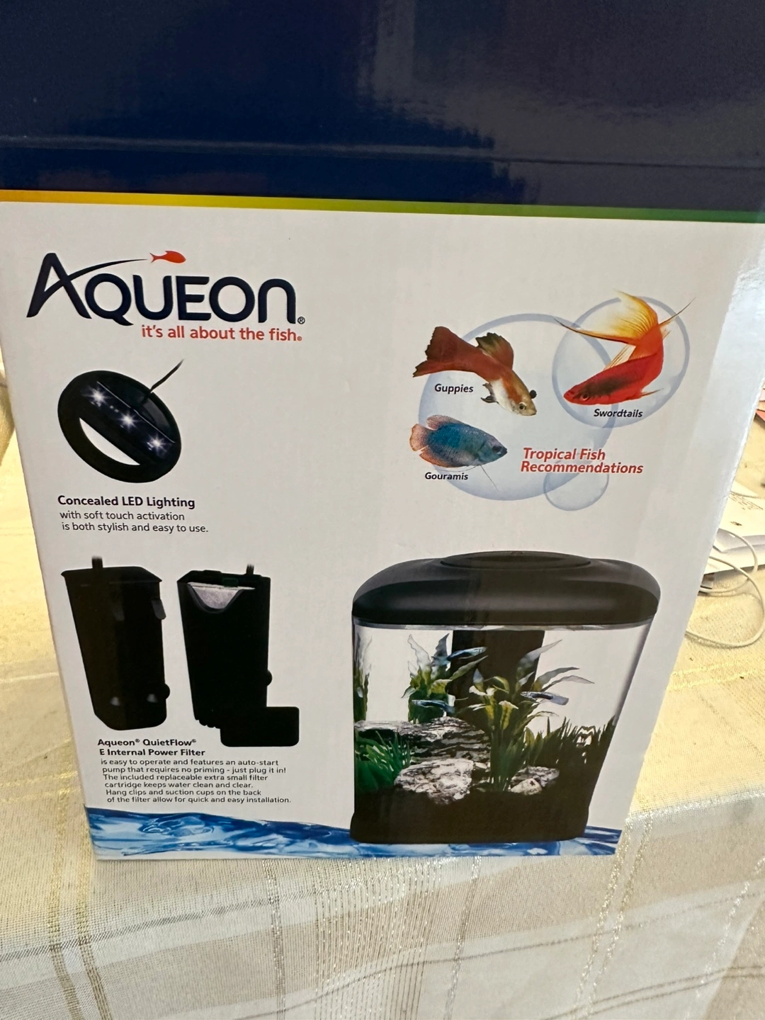 Aqueon fish tank. Includes filter and LED lighting. Easy to use. Compact design. Lightly used and excellent condition. Price is pretty firm