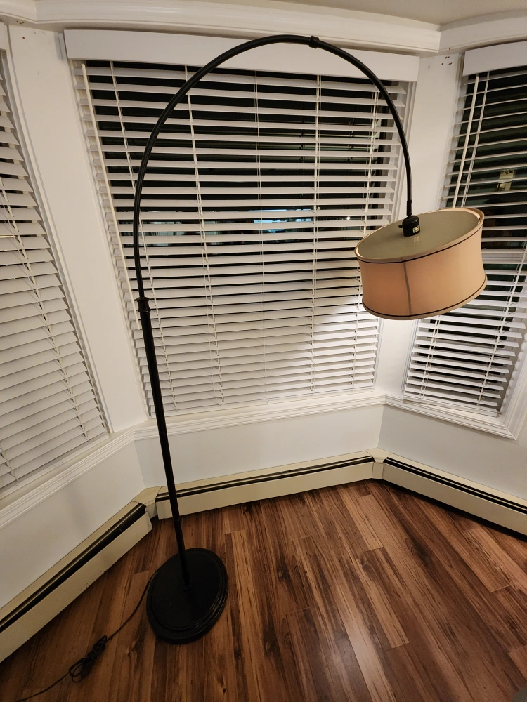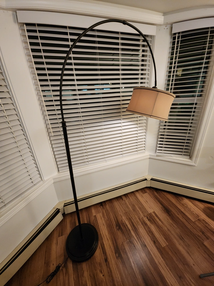 Selling a stylish arc floor lamp with a black finish. It's in great shape and would look lovely in any living room or bedroom. The lamp has a nice, wide arc that provides ample light. It's a great addition to any home!