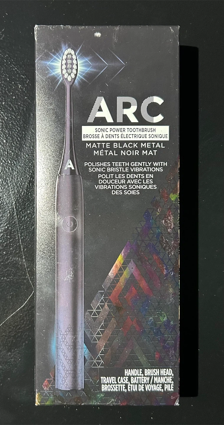 Selling a brand new ARC Sonic Power Toothbrush in Matte Black Metal! This toothbrush polishes teeth gently with sonic bristle vibrations. It also features a built-in 2-minute timer and a matched handle for easy grip. Includes a travel case, battery, and brush head! The box is included