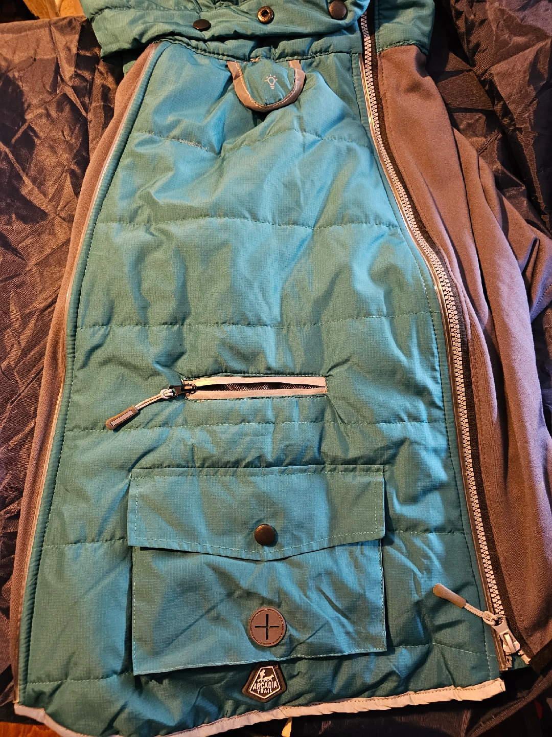 Arcadia Trail coat in size XXL. It's teal and grey. This coat has a quilted interior and a hood. brand new asking $20 obo