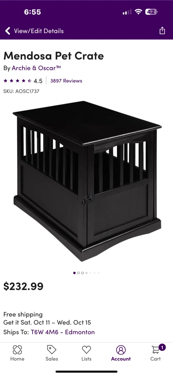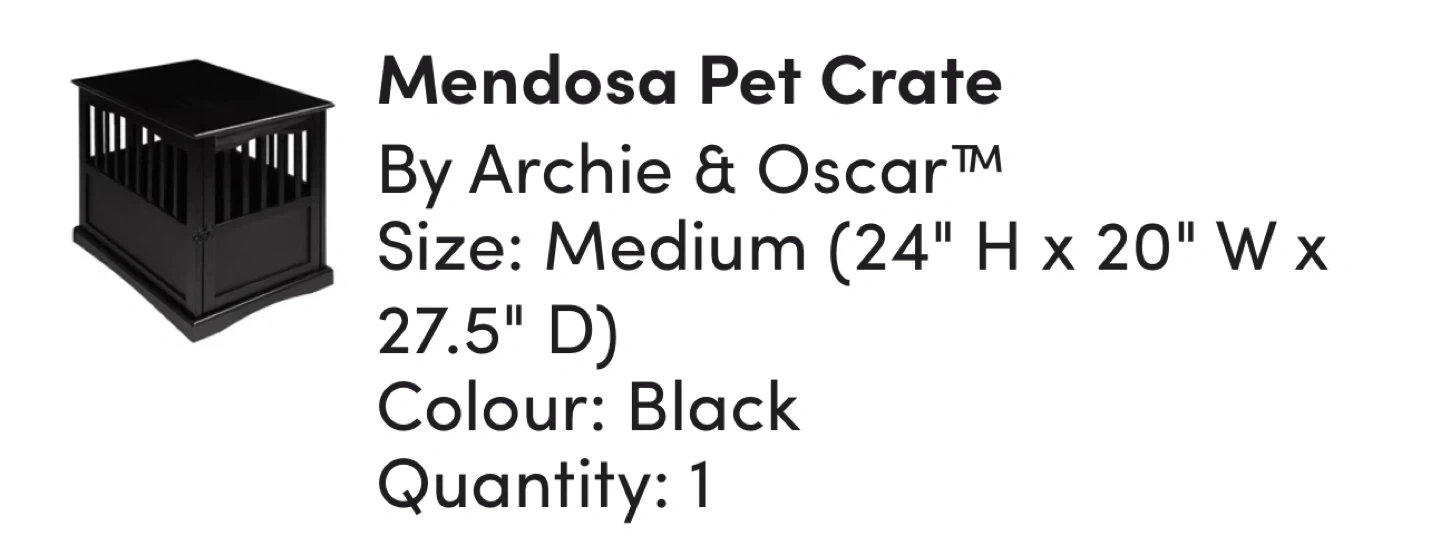 Selling a medium-sized Archie & Oscar Mendoza pet crate in black. It's 24" H x 20" W x 27.5" D. Originally bought for $232.99!