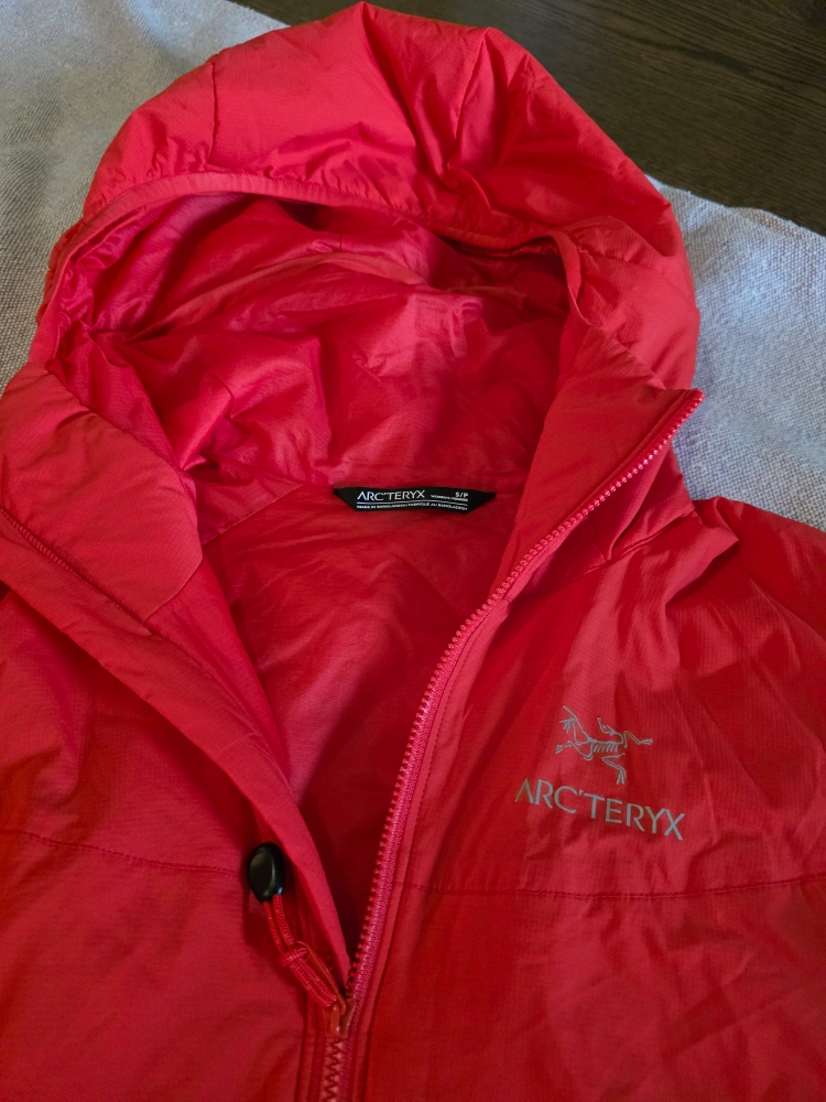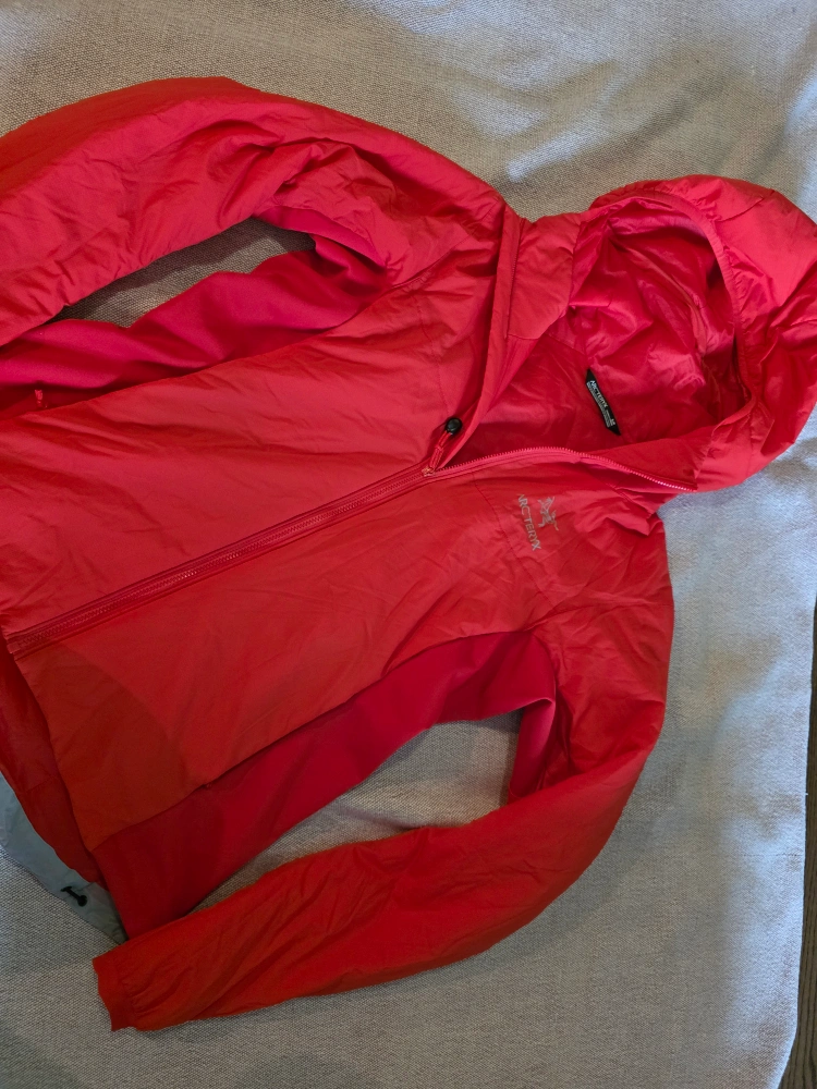 Arc'teryx Atom LT Hoody in a vibrant red colour. It's a size small (S). Great for layering or wearing on its own during milder weather. Perfect for outdoor activities or everyday wear!