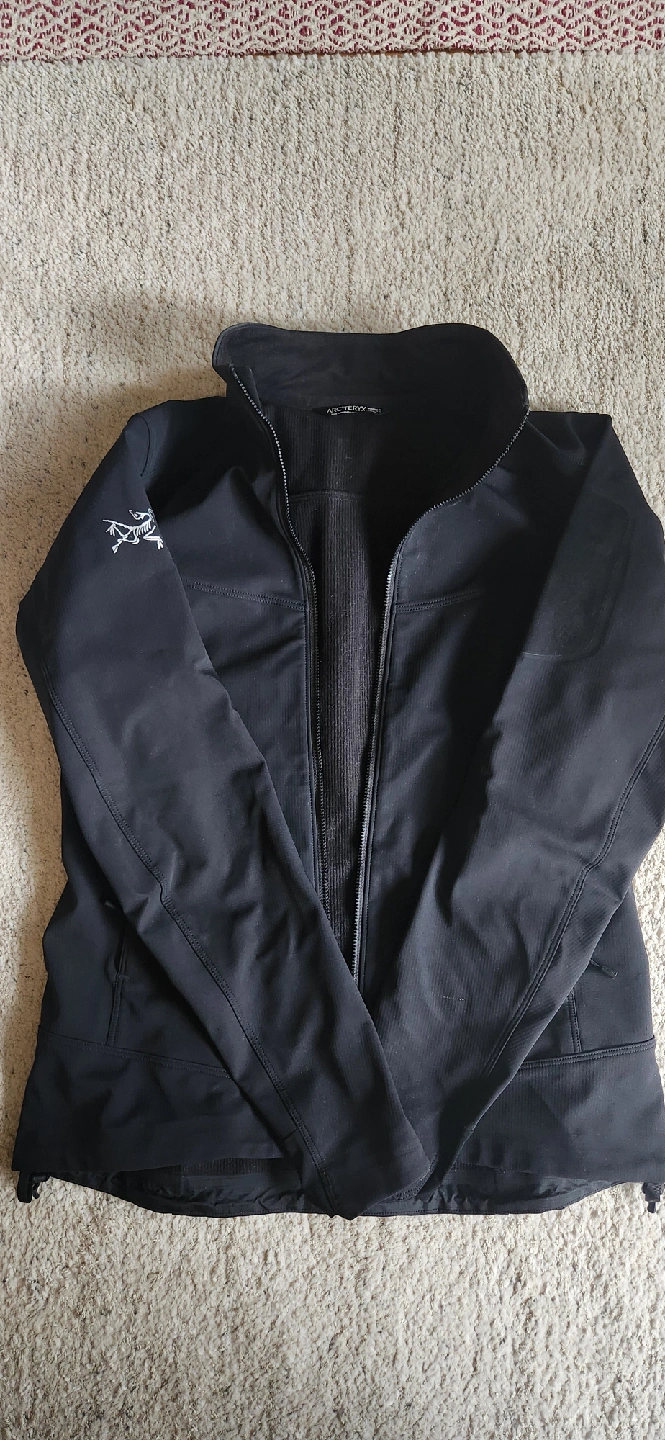 Selling a women's Arc'teryx jacket in size medium. Windproof and water resistant. It's in great condition and ready for a new home! The jacket is black and features the Arc'teryx logo on the sleeve.