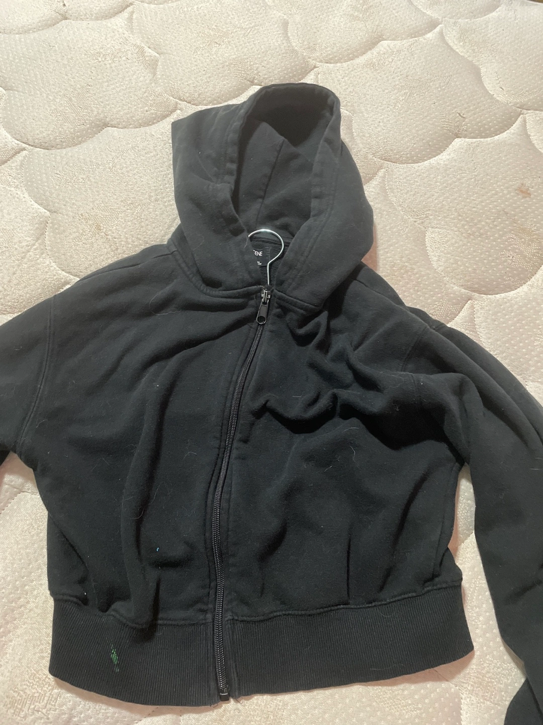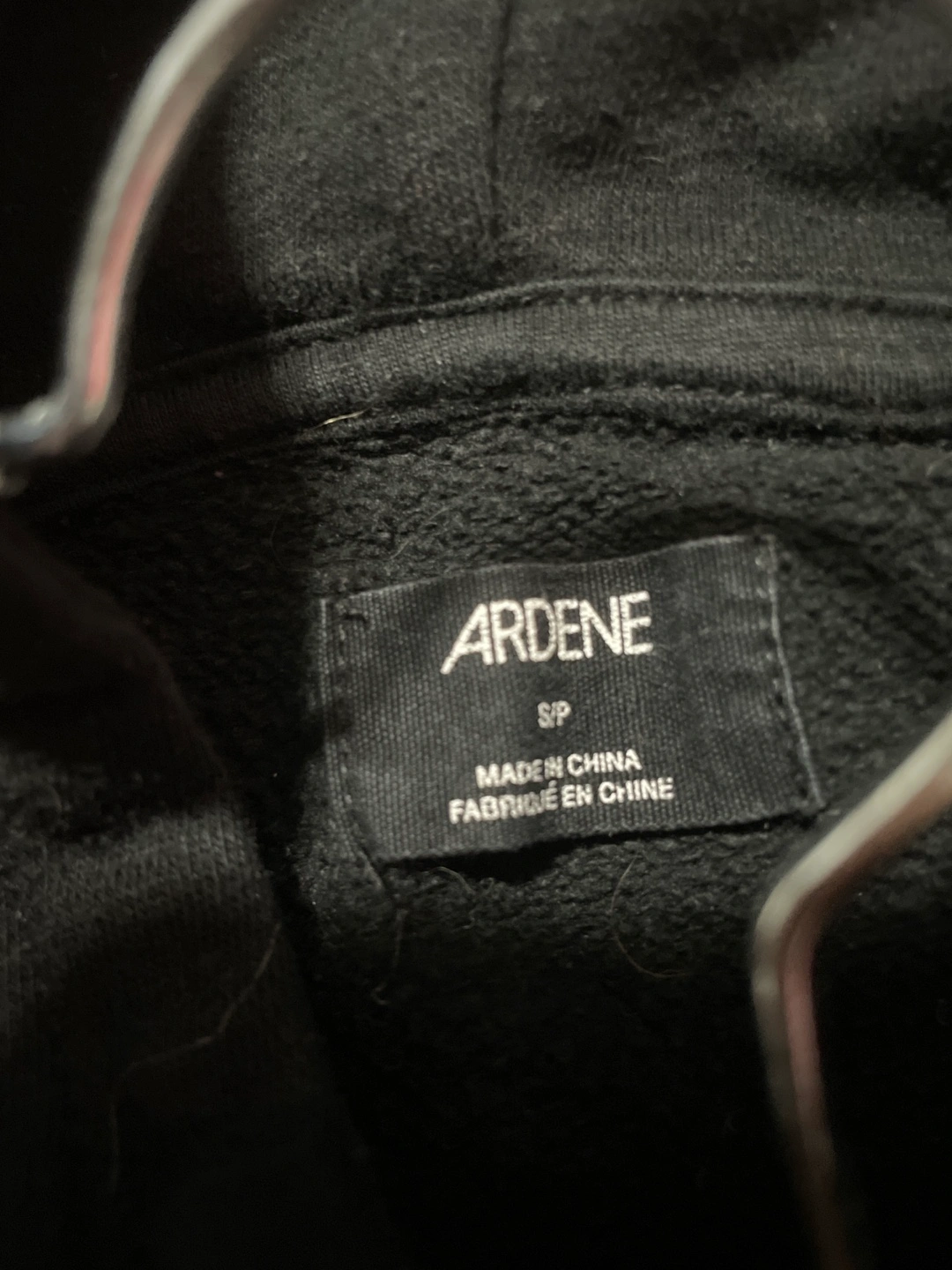 Selling an Ardene black hoodie in size S/P. It's a comfy and casual piece, perfect for layering or just lounging around. Please note there are some paint stains on the sleeve.
