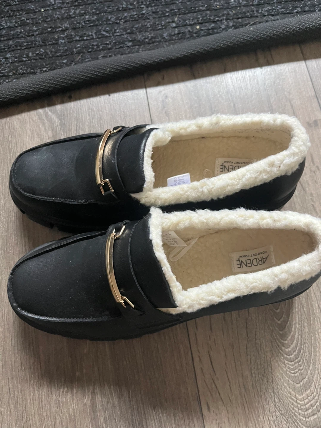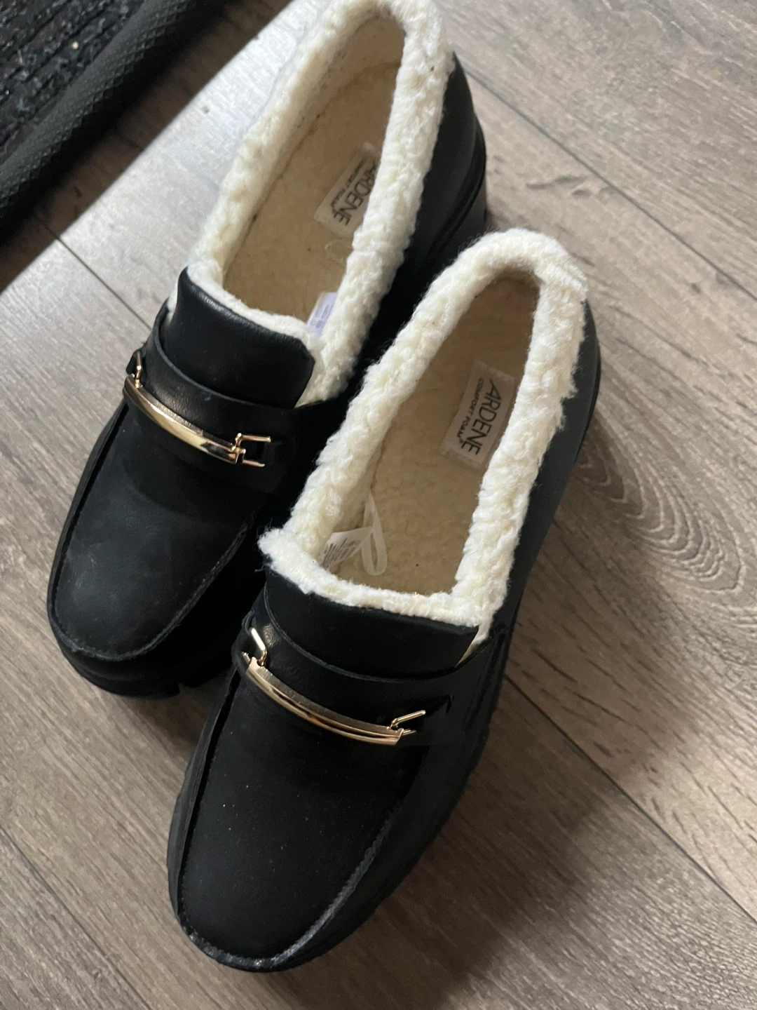 Cozy up with these Ardene black loafer mules! They feature a faux fur lining and a gold-tone buckle detail. Perfect for adding a touch of warmth and style to your everyday look