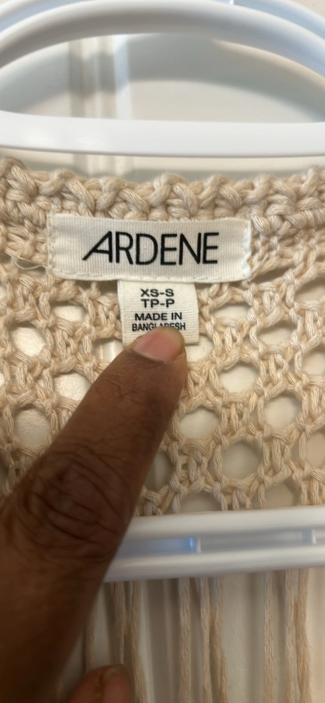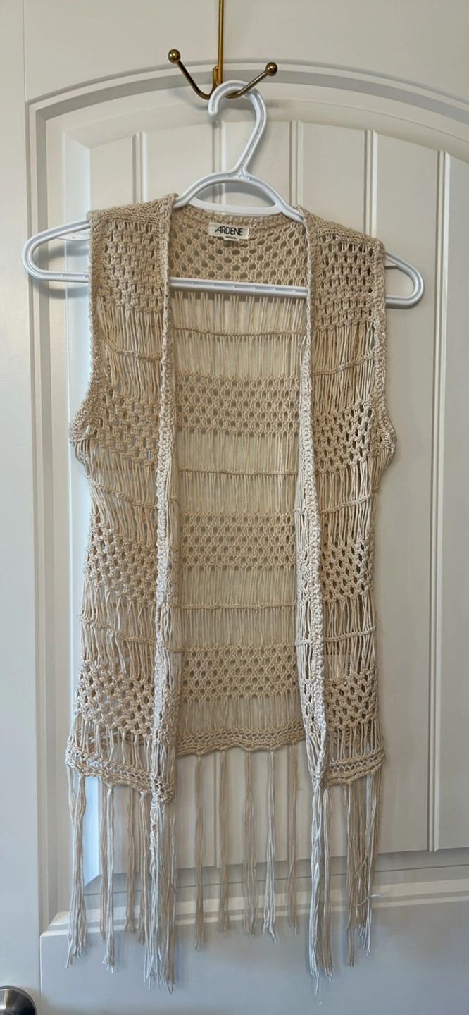 Selling a cute Ardene crochet vest with fringe! It's a size XS/S and has a lovely open knit design. Perfect for layering or adding a bohemian touch to your outfit