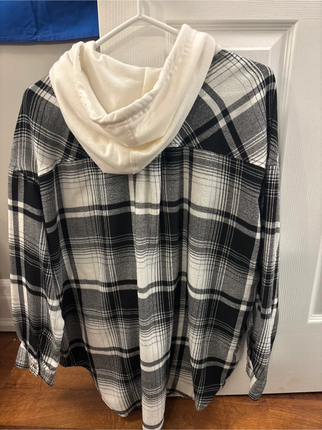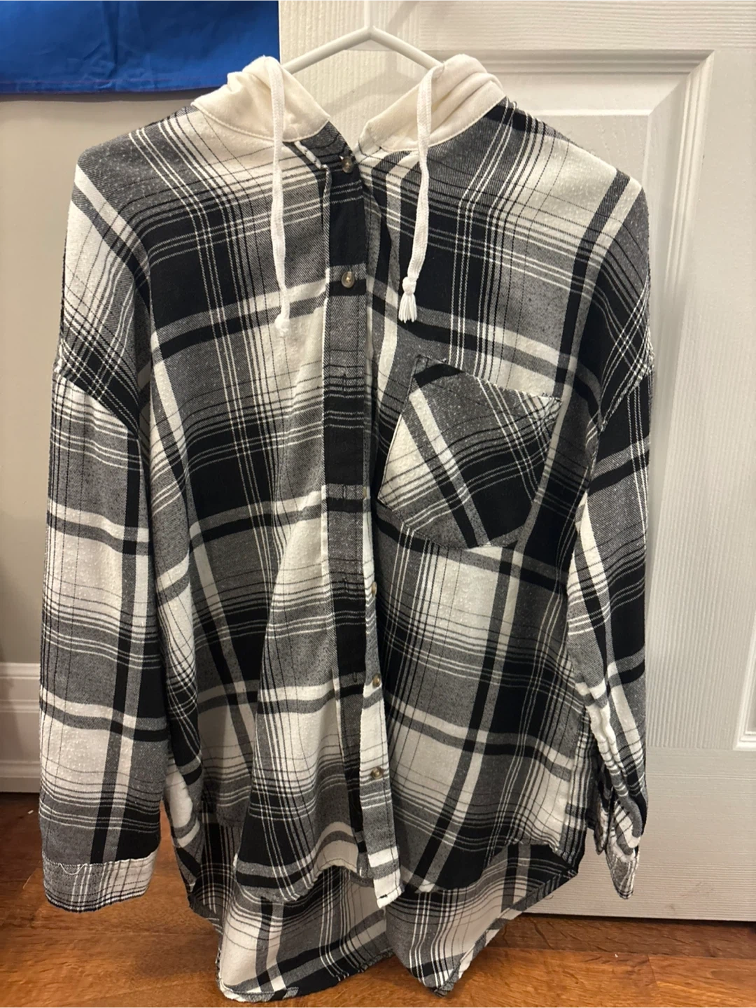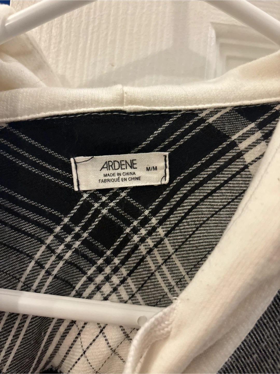 Selling a cozy Ardene plaid flannel with a hood! It's a size M/M and features a classic black and white plaid pattern. Perfect for layering or wearing on its own. It's in great condition and ready for a new home!
