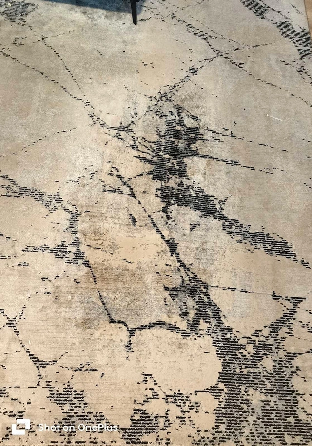 Enhance your living space with this stylish area rug, showcasing a unique abstract pattern in neutral tones. This rug has been used and has some wear, which gives it character. Measuring approximately 5x8 feet, it's the perfect size to anchor your furniture in a living room or bedroom. * Size: Approximately 6x8 feet * Material: Synthetic fibers * Colour: Neutral tones with abstract design