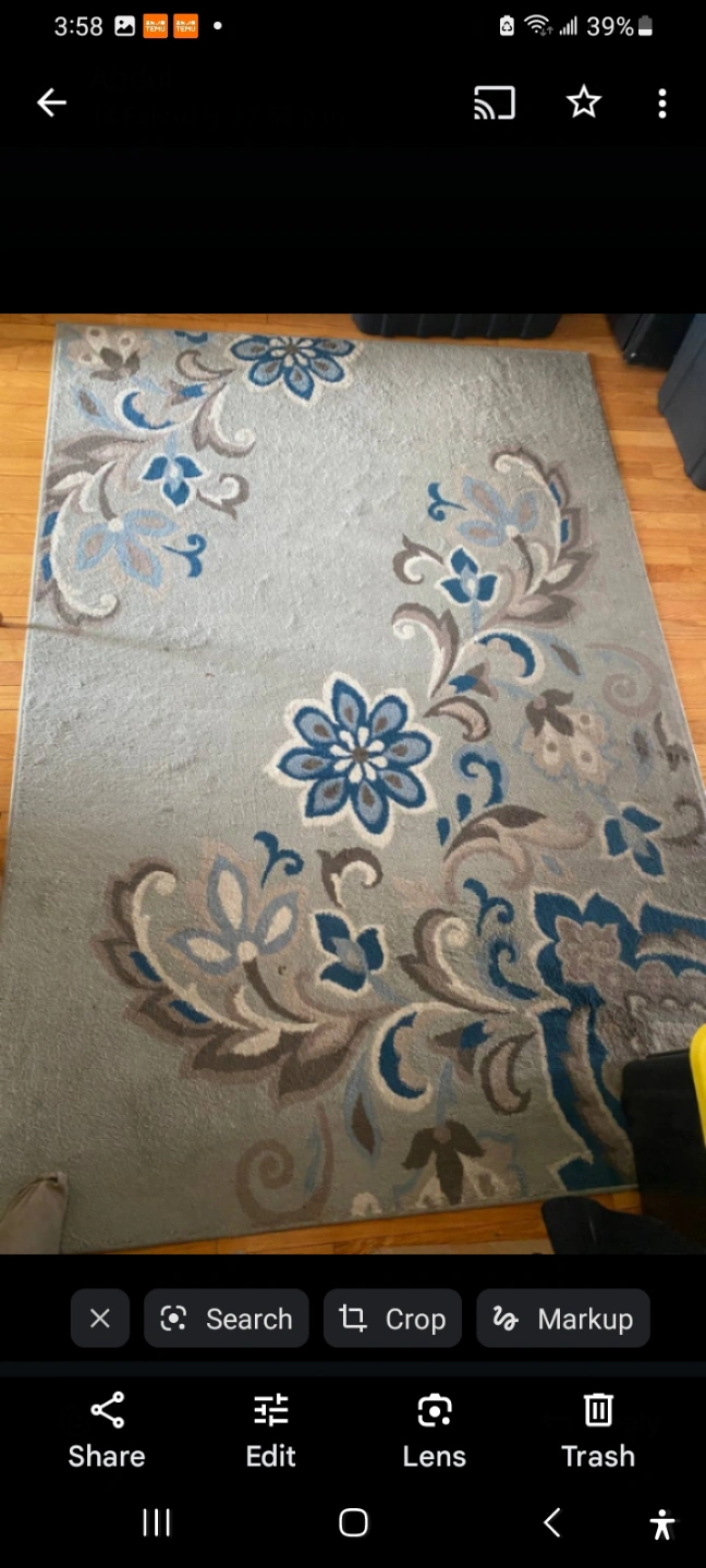 Beautiful area rug. Features a floral design in shades of blue, grey, and beige. Soft and comfortable underfoot. Great for living room or bedroom.