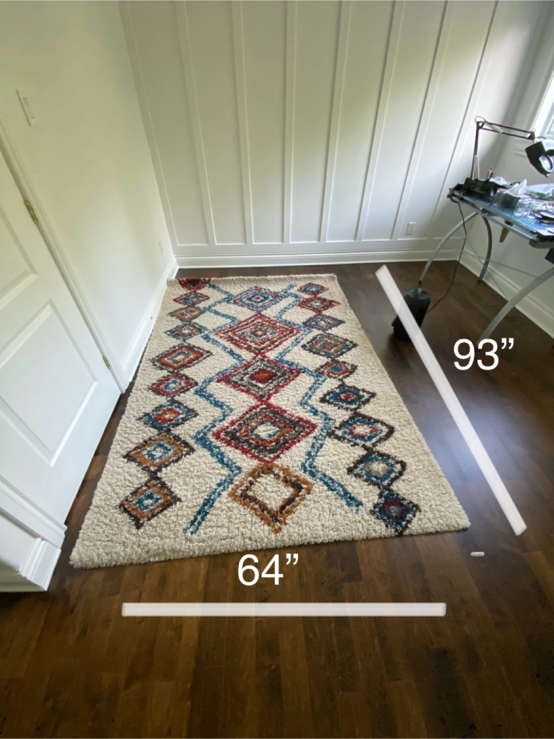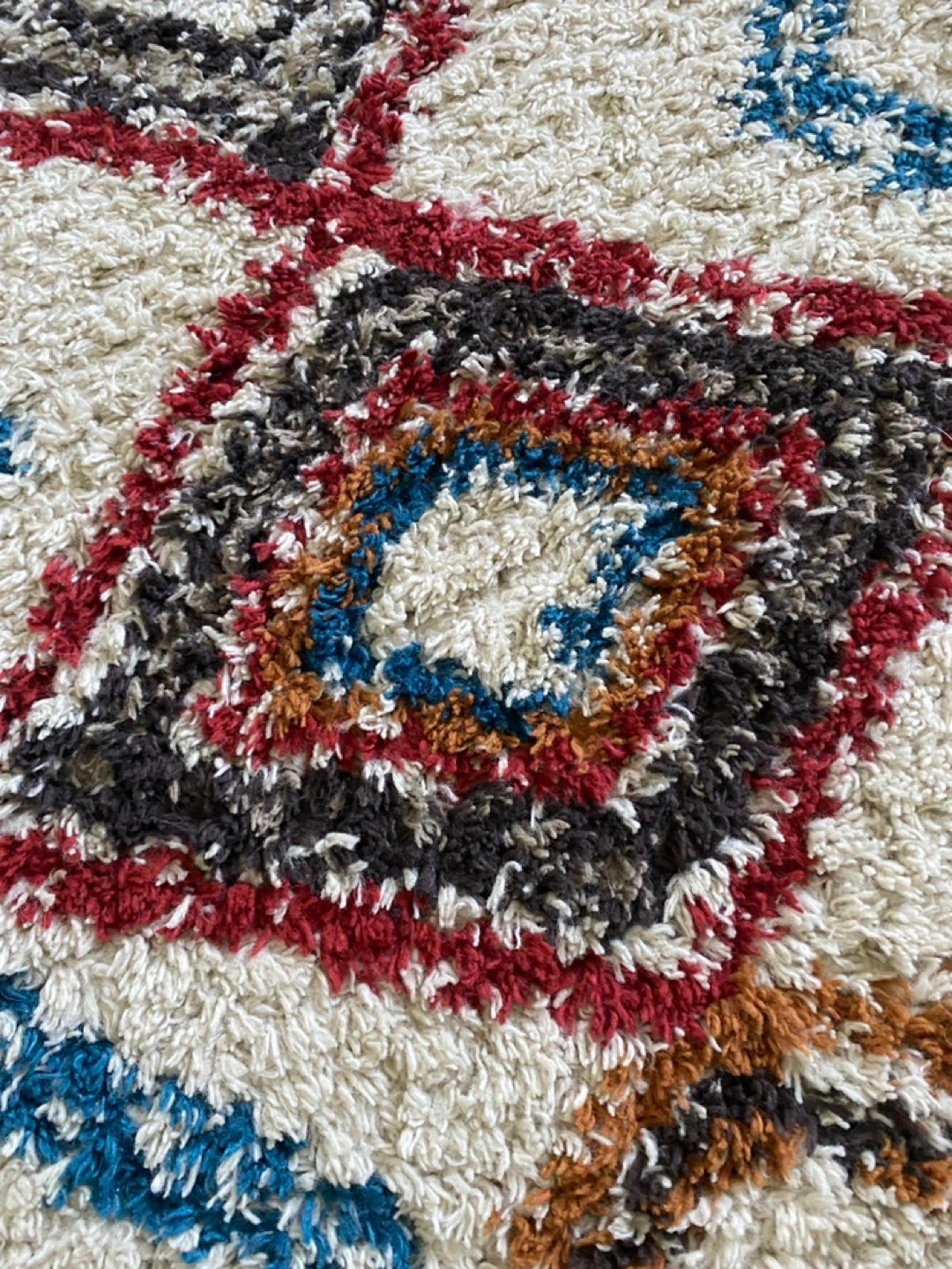 Beautiful area rug. Cream background, with a bold pattern in red, blue, and brown. Would be a lovely addition to any home and would make a perfect spot to relax. Cat friendly home, smoke free