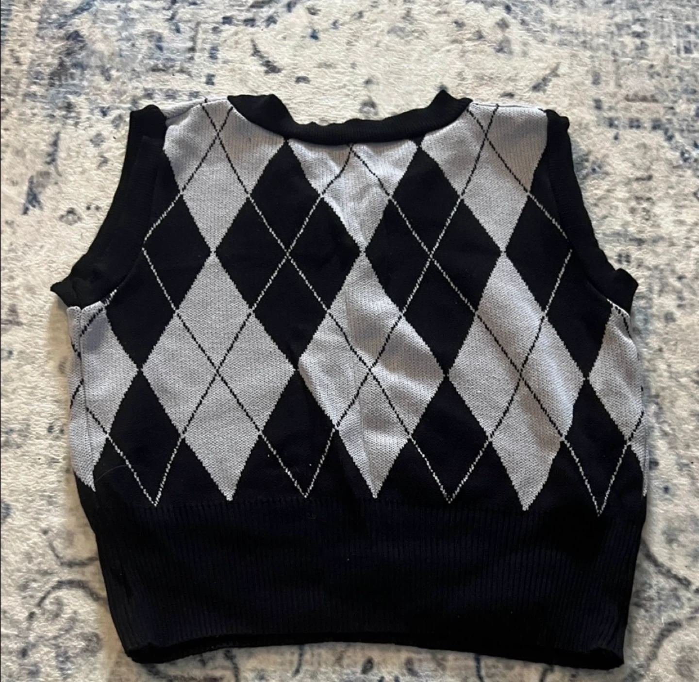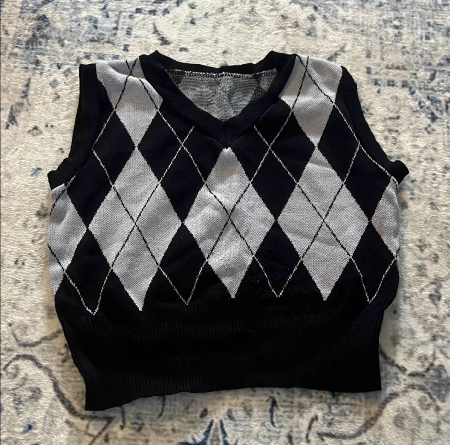 Selling a cute argyle sweater vest in black and grey. It's in great condition and perfect for layering! The material is soft and comfy, making it a great addition to any outfit