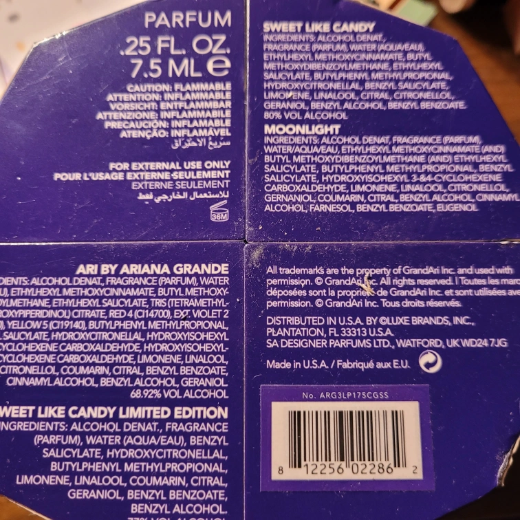 Limited edition gift set. Includes miniature bottles of Sweet Like Candy and Ari fragrances. New, unopened box.