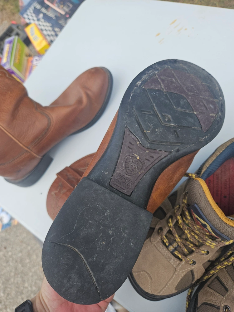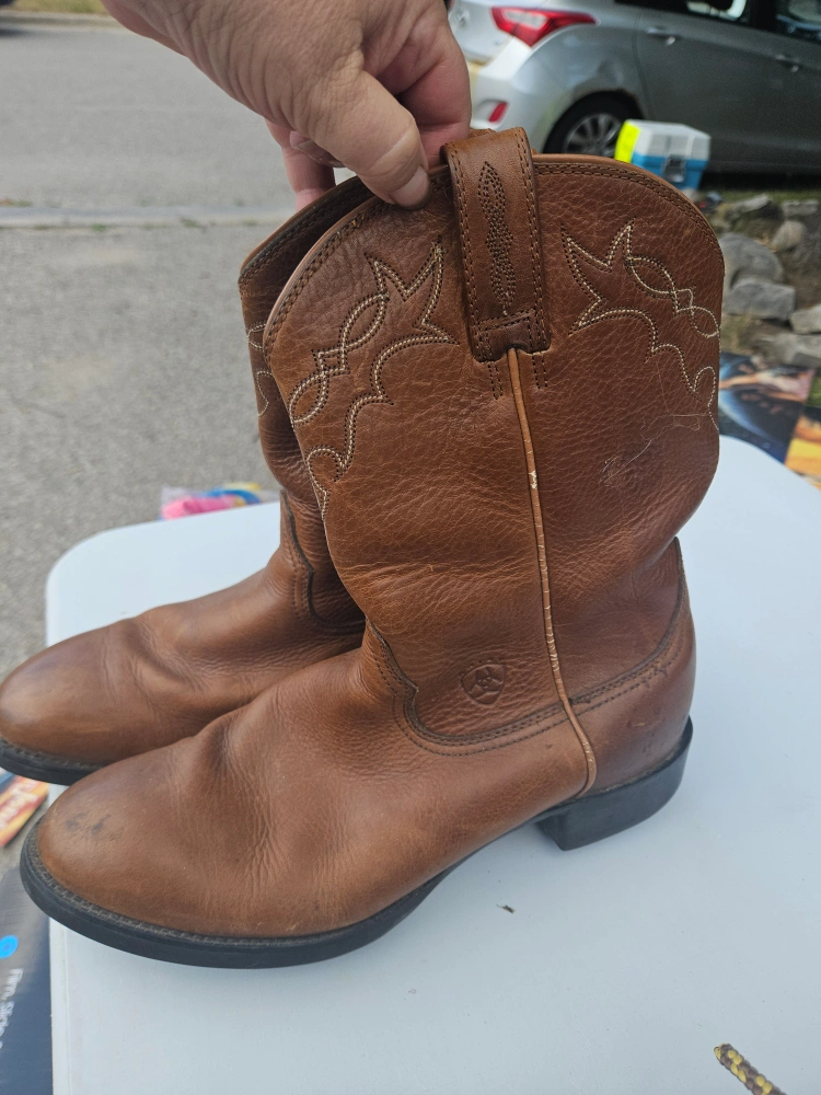 Selling a pair of Ariat cowboy boots in brown leather. They are in used condition with some visible wear, but still have lots of life left. The size is 9M (US). Leather upper with man-made balance materials.