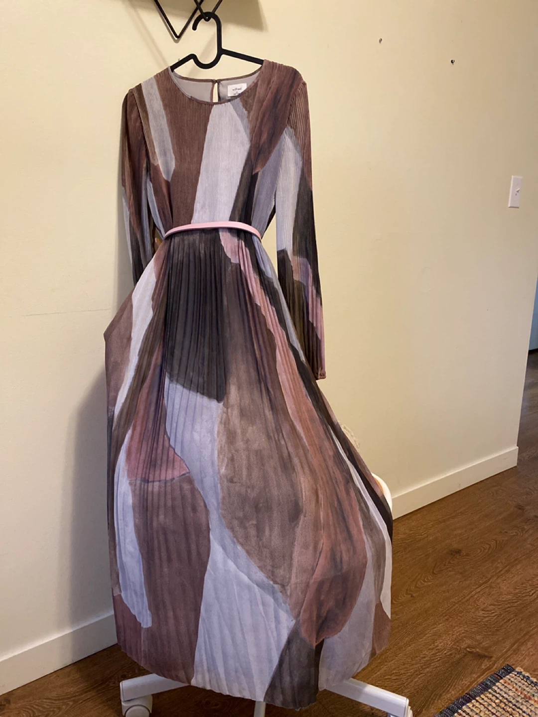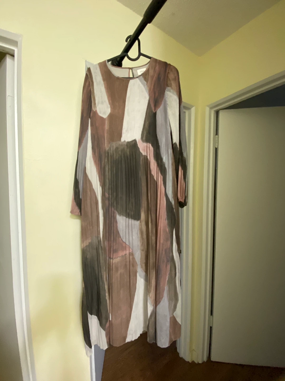 Selling this stylish dress with an abstract print and pleated design. It's perfect for adding a unique touch to your wardrobe. The dress features a beautiful blend of colours and a comfortable fit. It's in great condition and ready for a new home!