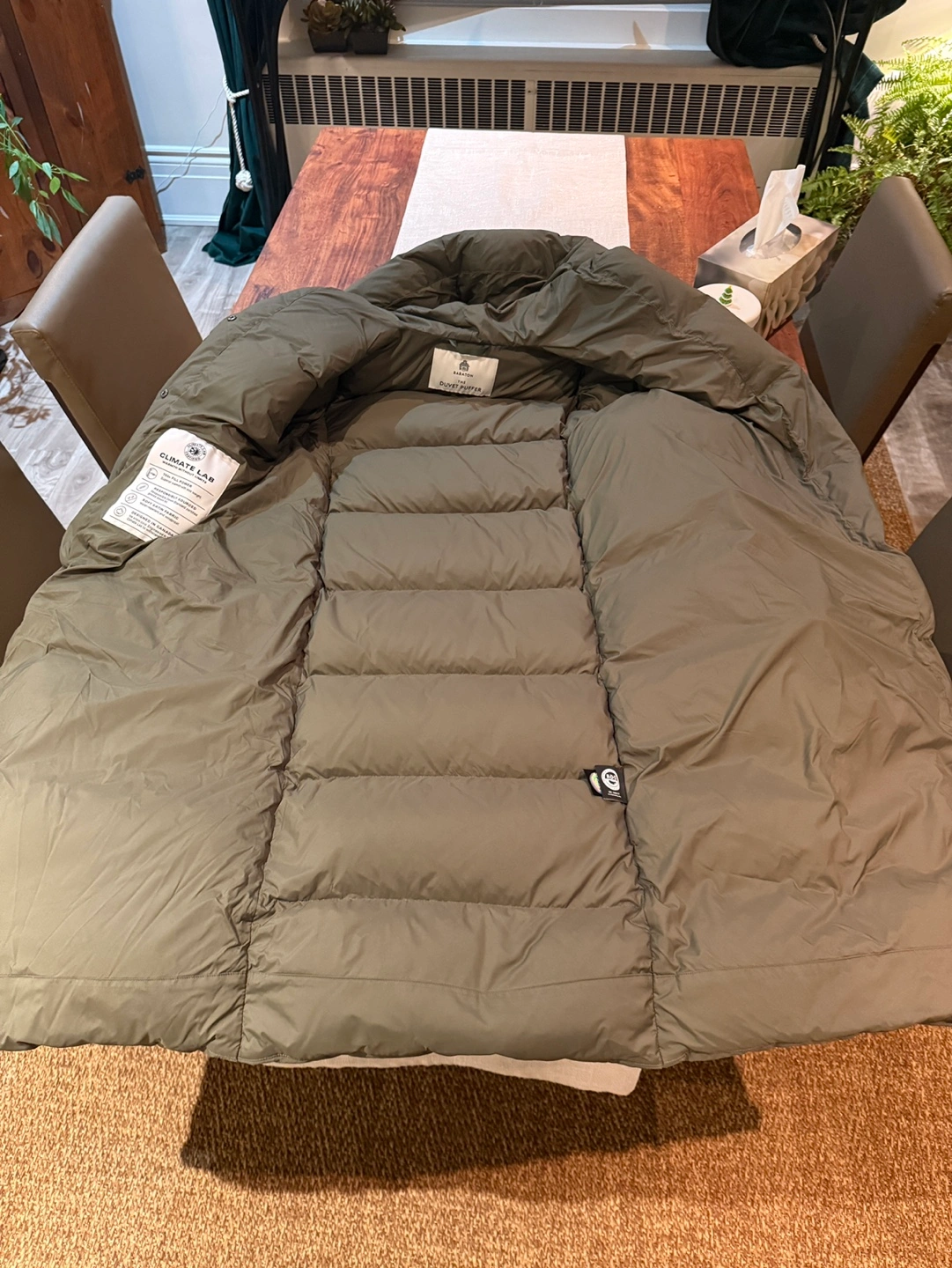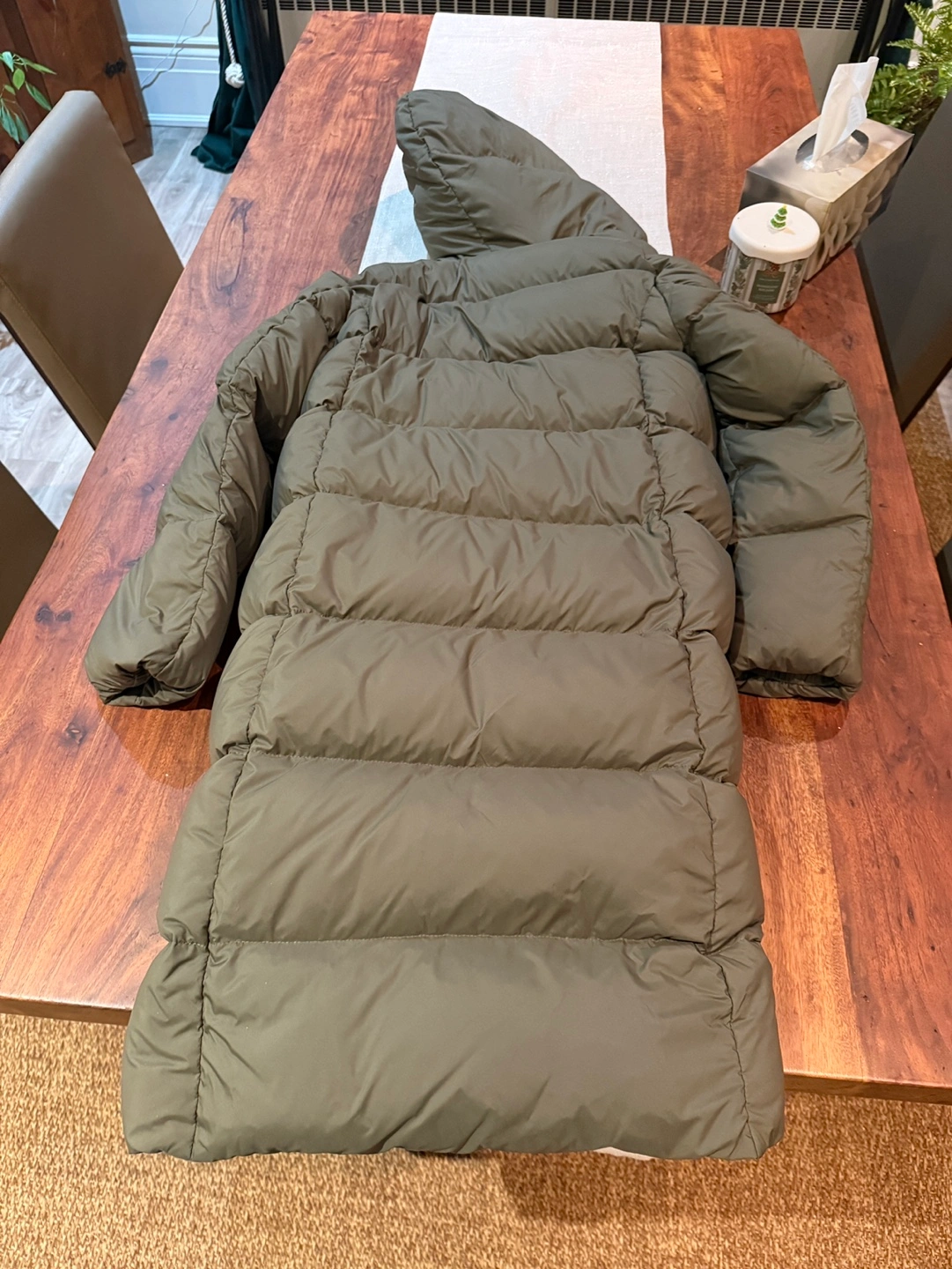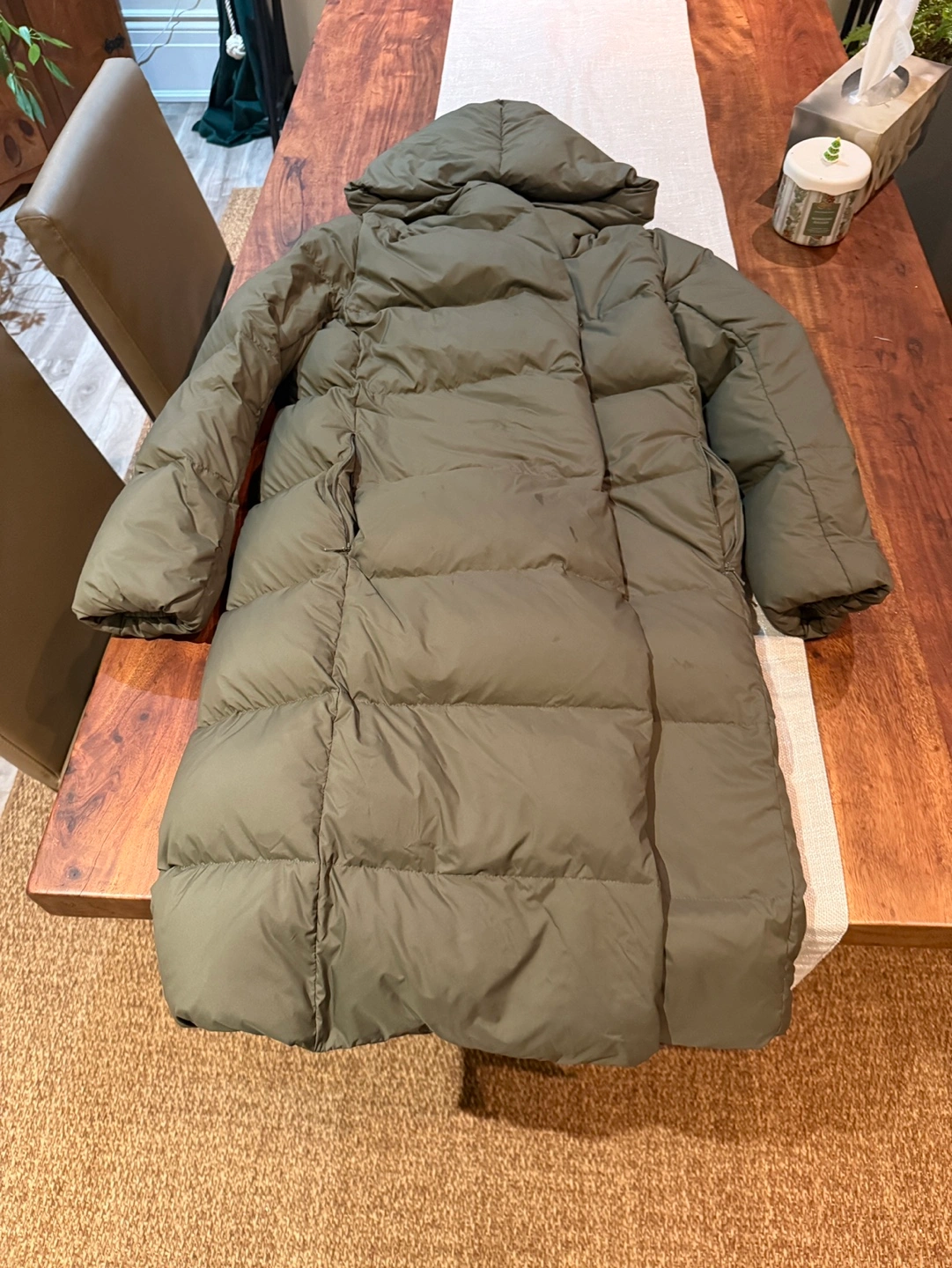 Olive green long puffer coat. Features a relaxed fit, hooded neckline, and long sleeves. Multiple pockets. Excellent for cold weather. Worn just a few times! Got another jacket for my bday so don’t need this one. Has a minor stain on front but would probably come out with wash/dry cleaning. Retails at aritzia for $375+tax!