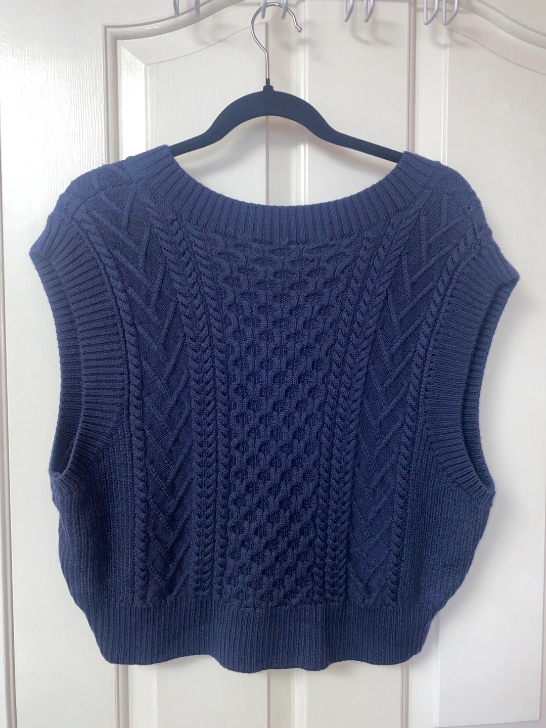A navy blue knitted vest in great condition! It's a stylish and comfortable piece that can be layered with different outfits. Perfect for adding a touch of warmth and texture to your look