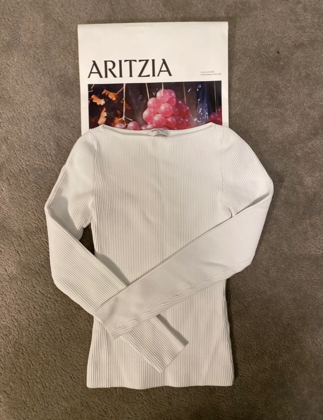 Aritzia Babaton sculpt knit white long-sleeve top. Boatneck and slim fit. Only worn once, realized too small. Retailed for $80, selling 30. Willing to ship and negotiable payment and prices!