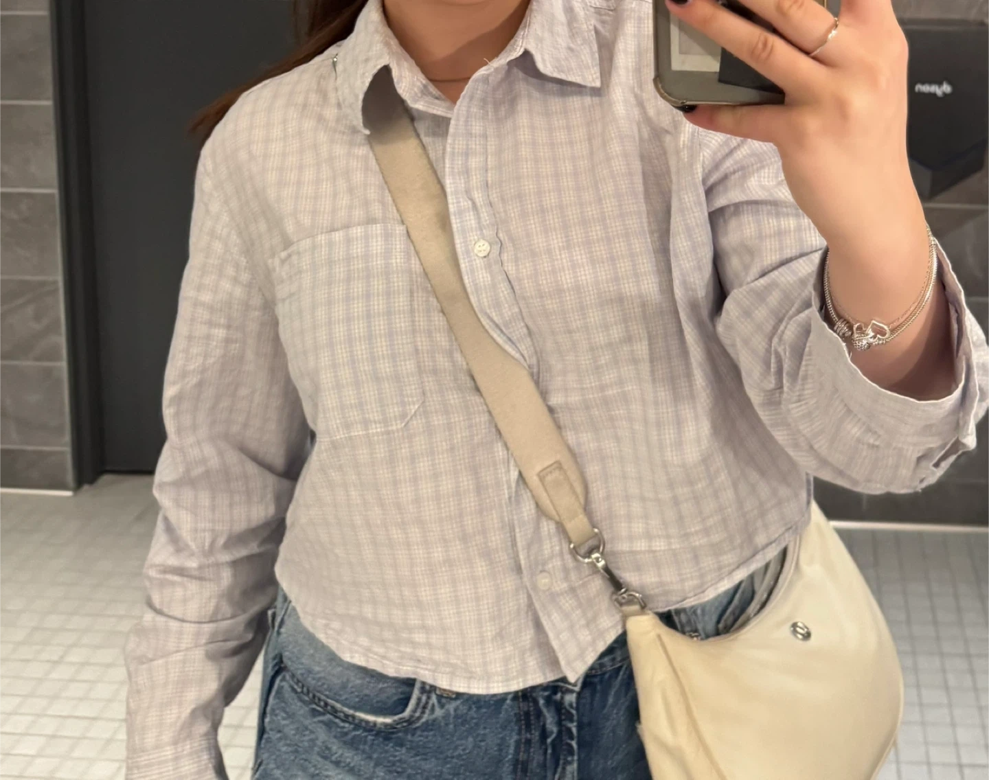 Selling a cute Aritzia button-up shirt in a light plaid pattern. It's a linen blend, perfect for warmer weather. Great for layering or wearing on its own