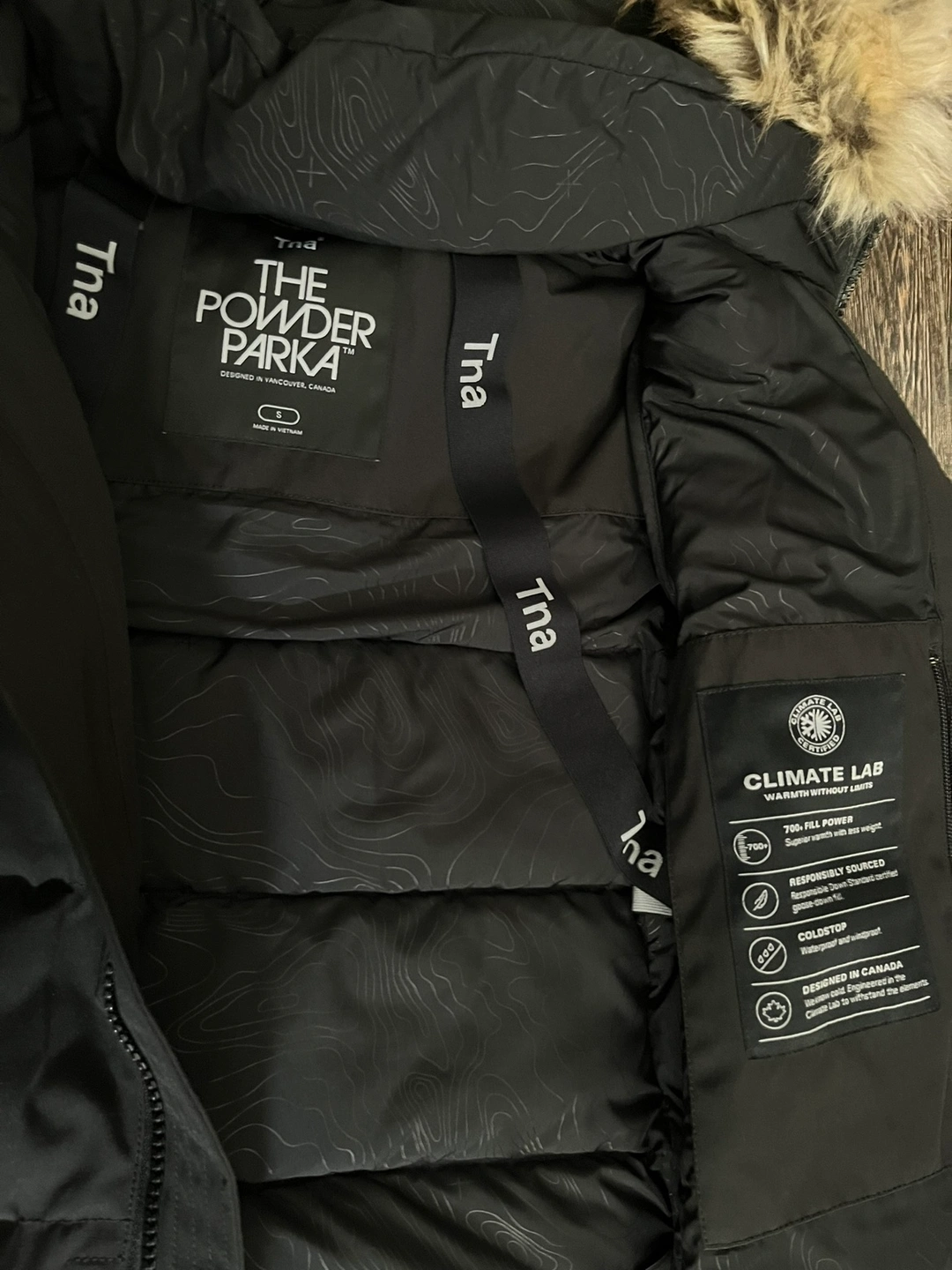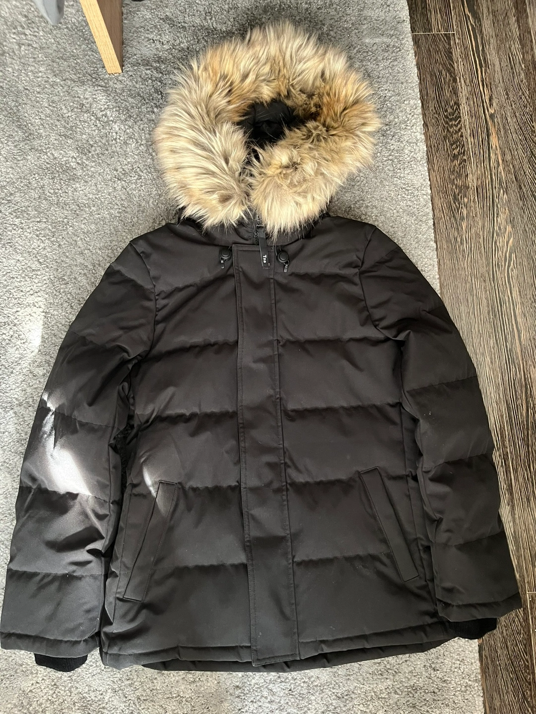 Men’s Aritzia Powder parka jacket in very good condition. Comes with detachable fur hood. Black color.