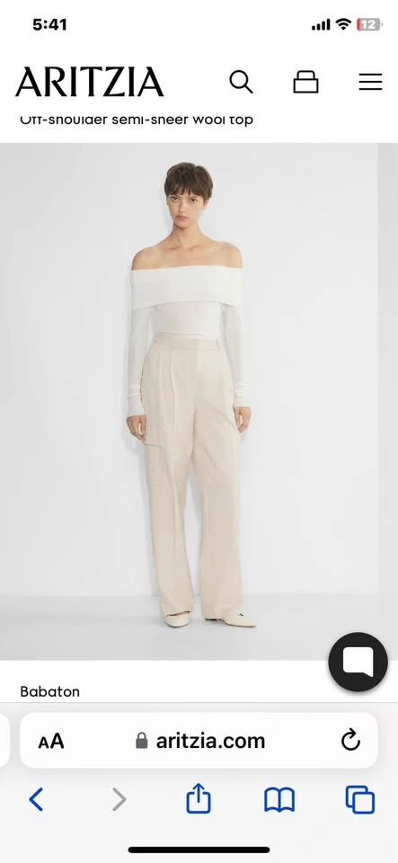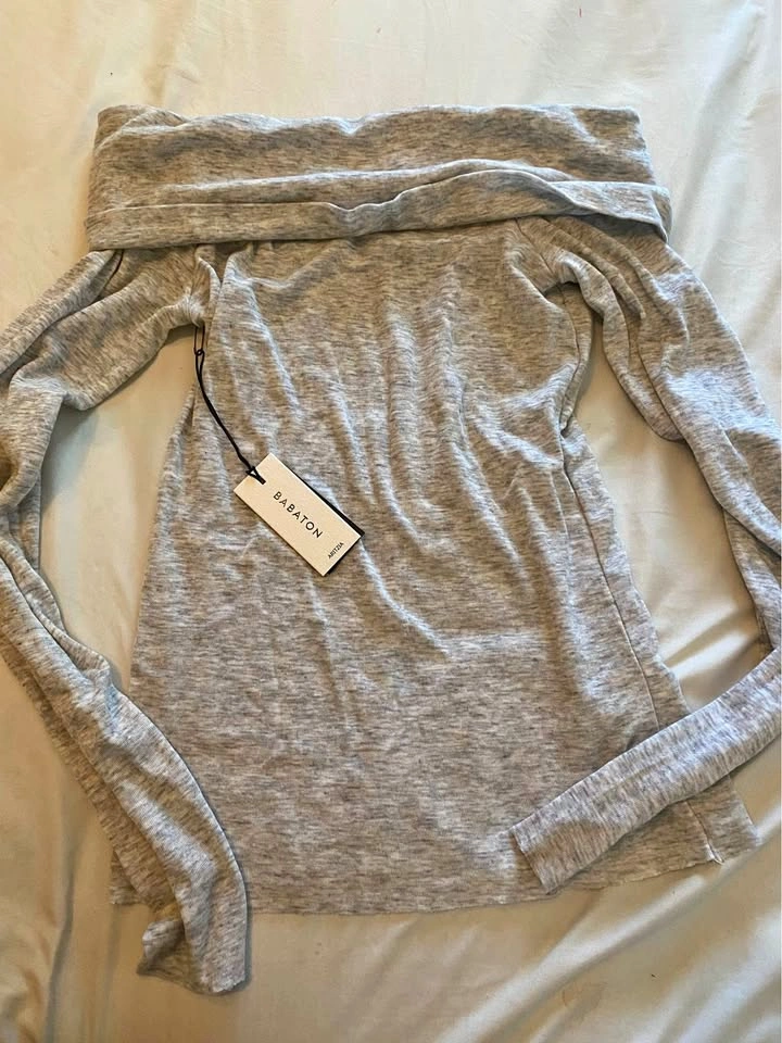 This is an off-shoulder top with a tight fit. It's cut from soft, semi-sheer gauzy fabric that's made with wool and TENCEL™ Lyocell — responsibly sourced wood-based fibres produced through a closed-loop system that reduces environmental impact. Brand new with tag. Fits small. Should fit xs. Pick up near Yonge and 16th avenue or Fairview mall. Check out my other listings.