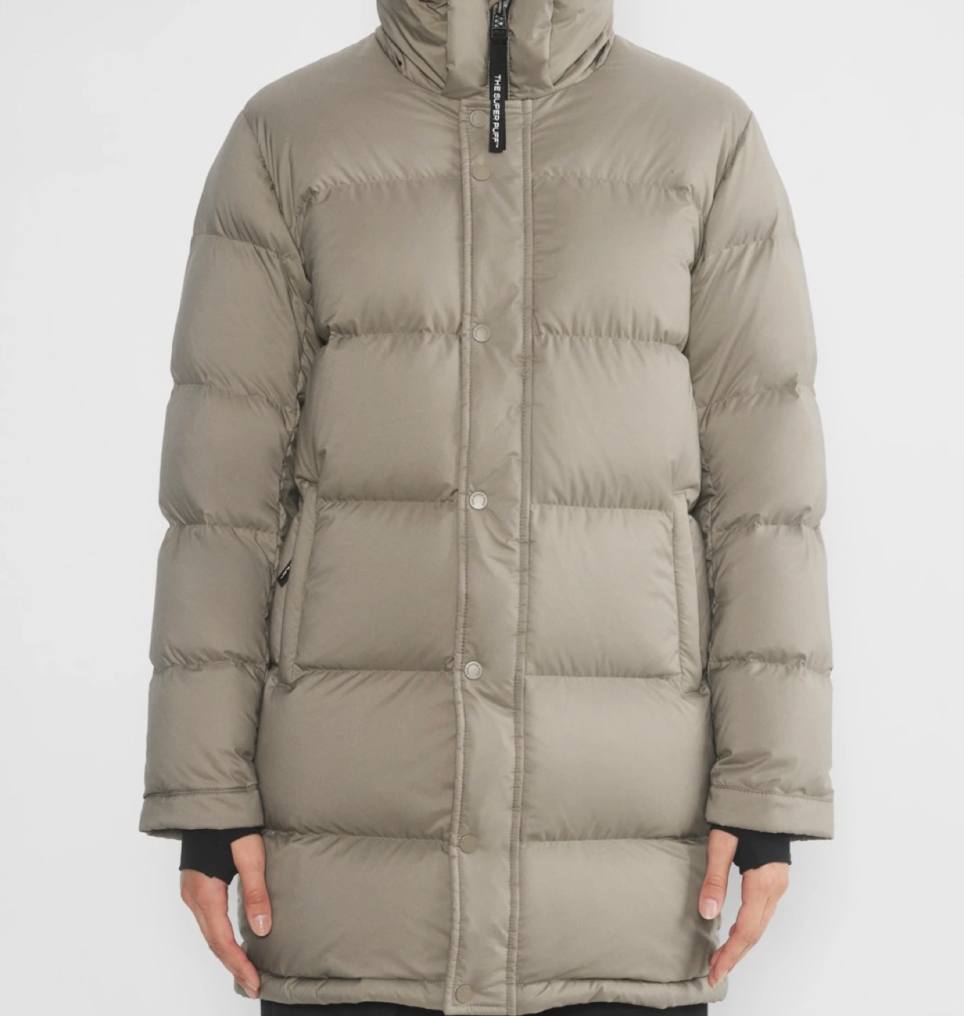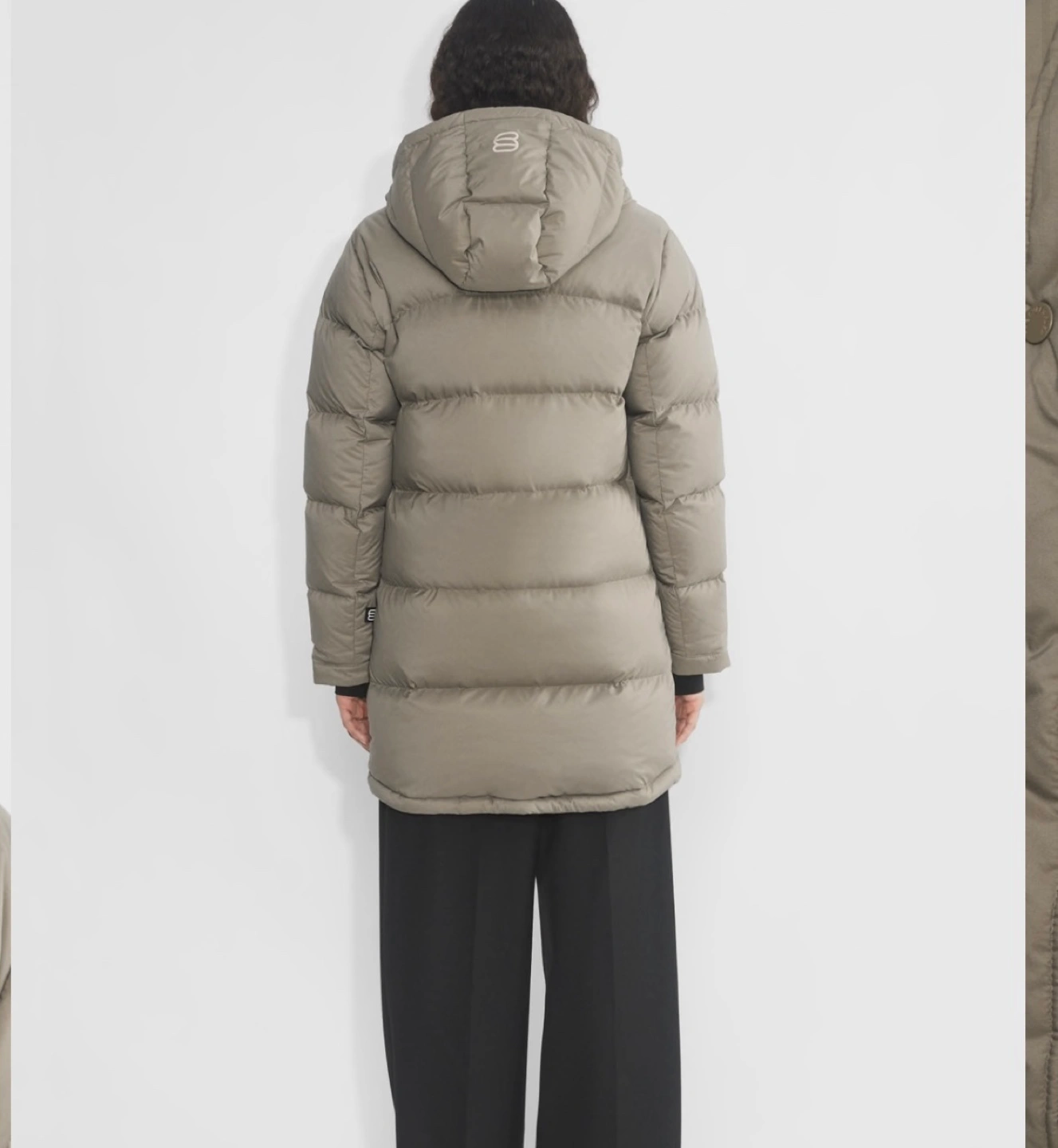 Mid puffer jacket with a hood. Modern taupe colour medium size Freshly dry cleaned