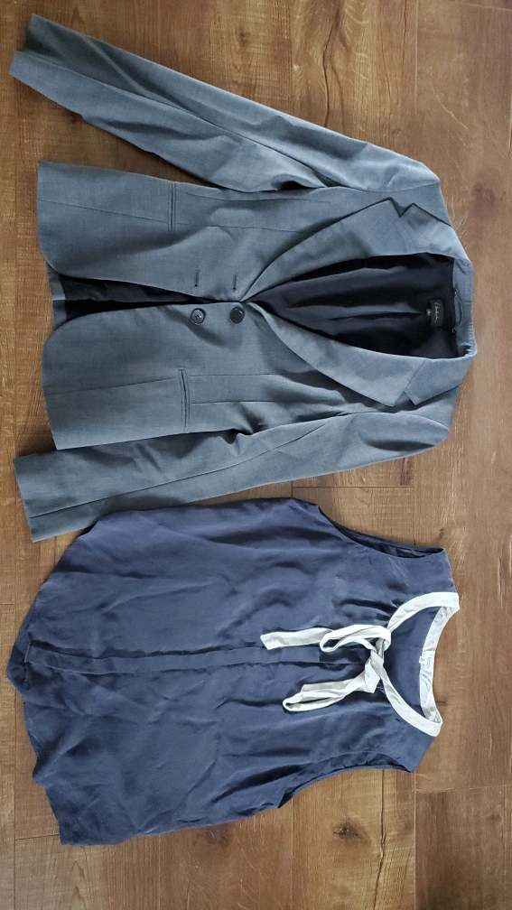 Aritzia - A grey wool blazer and a navy silk top by T. Babaton. The blazer is size 2 and the top is size M.
