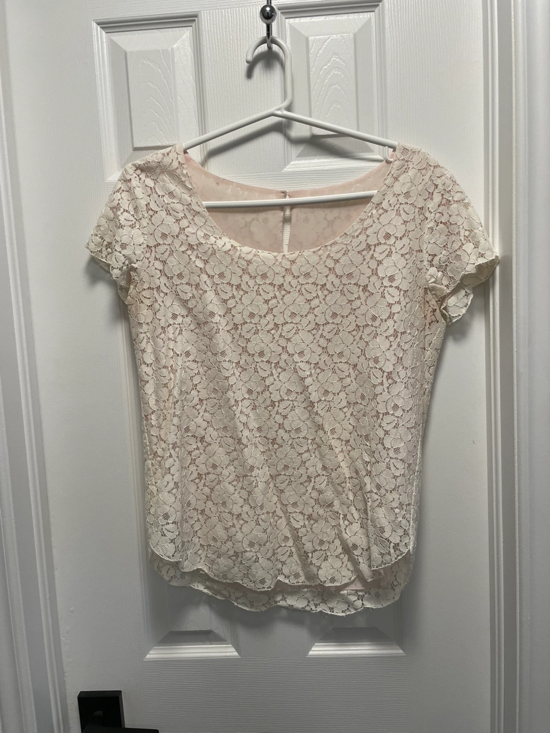 White lace top with short sleeves and a scoop neckline. The top has a slightly longer back than front. It is made of a delicate lace fabric and is perfect for a special occasion.