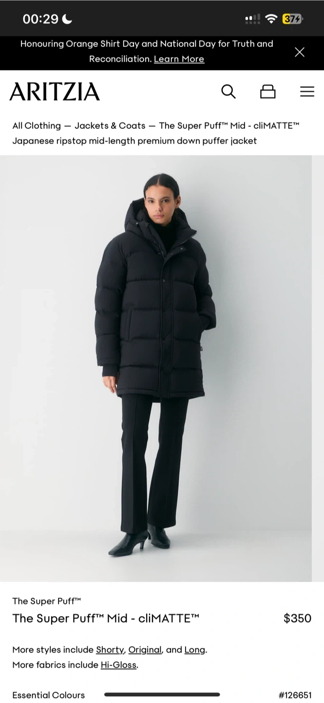 Selling an Aritzia The Super Puff™ Mid - cLiMATTE™ jacket in black, size small. It's in great condition and ready to keep you warm! Originally bought for $368+tax, worn only a few times. Excellent condition, no flaws. Warm, lightweight, and stylish for fall/winter. 💲 Asking: $289 (firm, already discounted) ✅ Serious buyers only