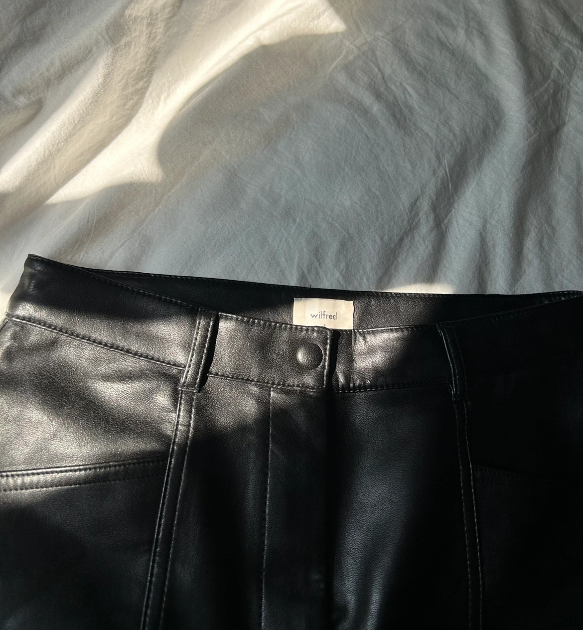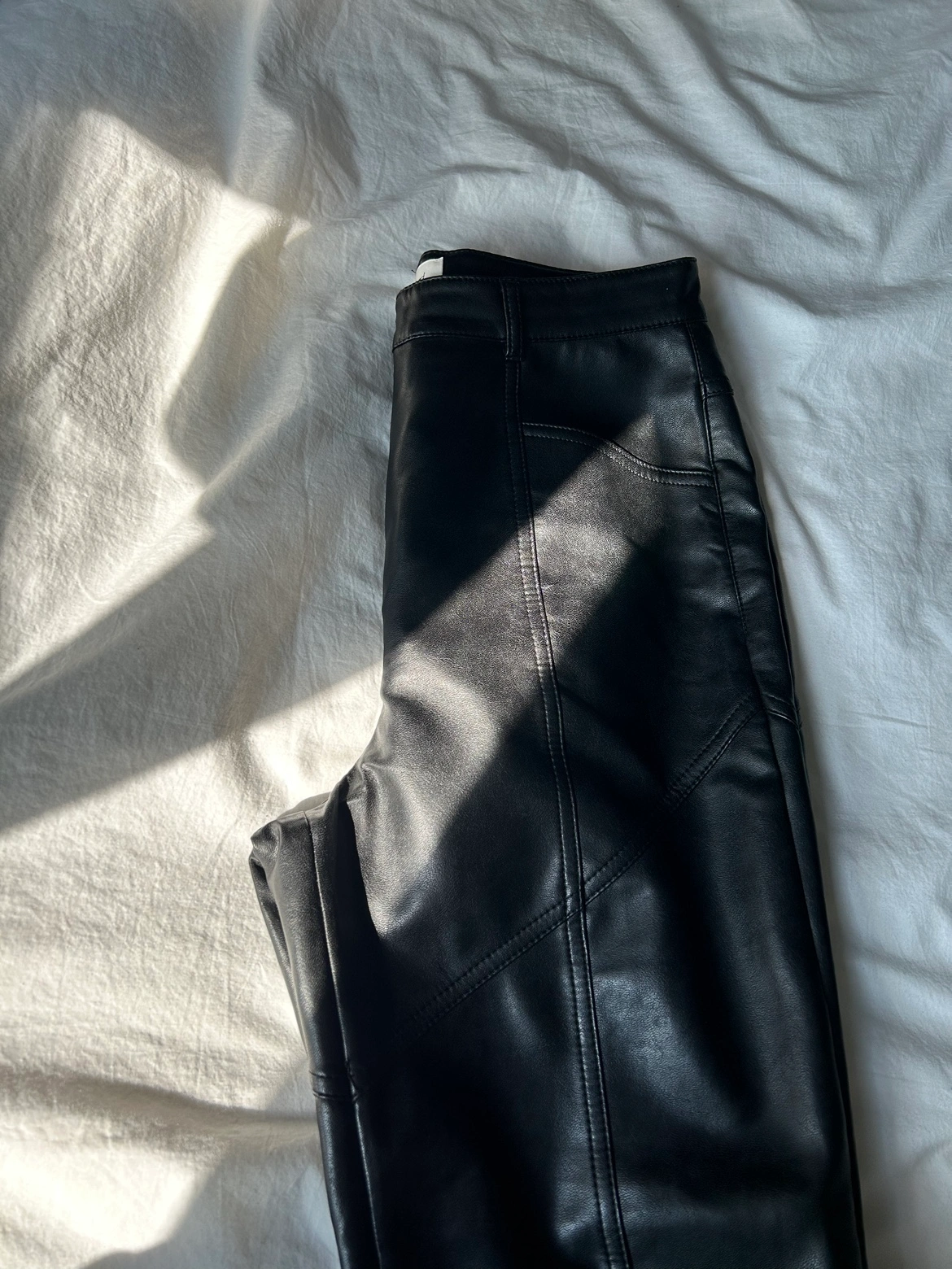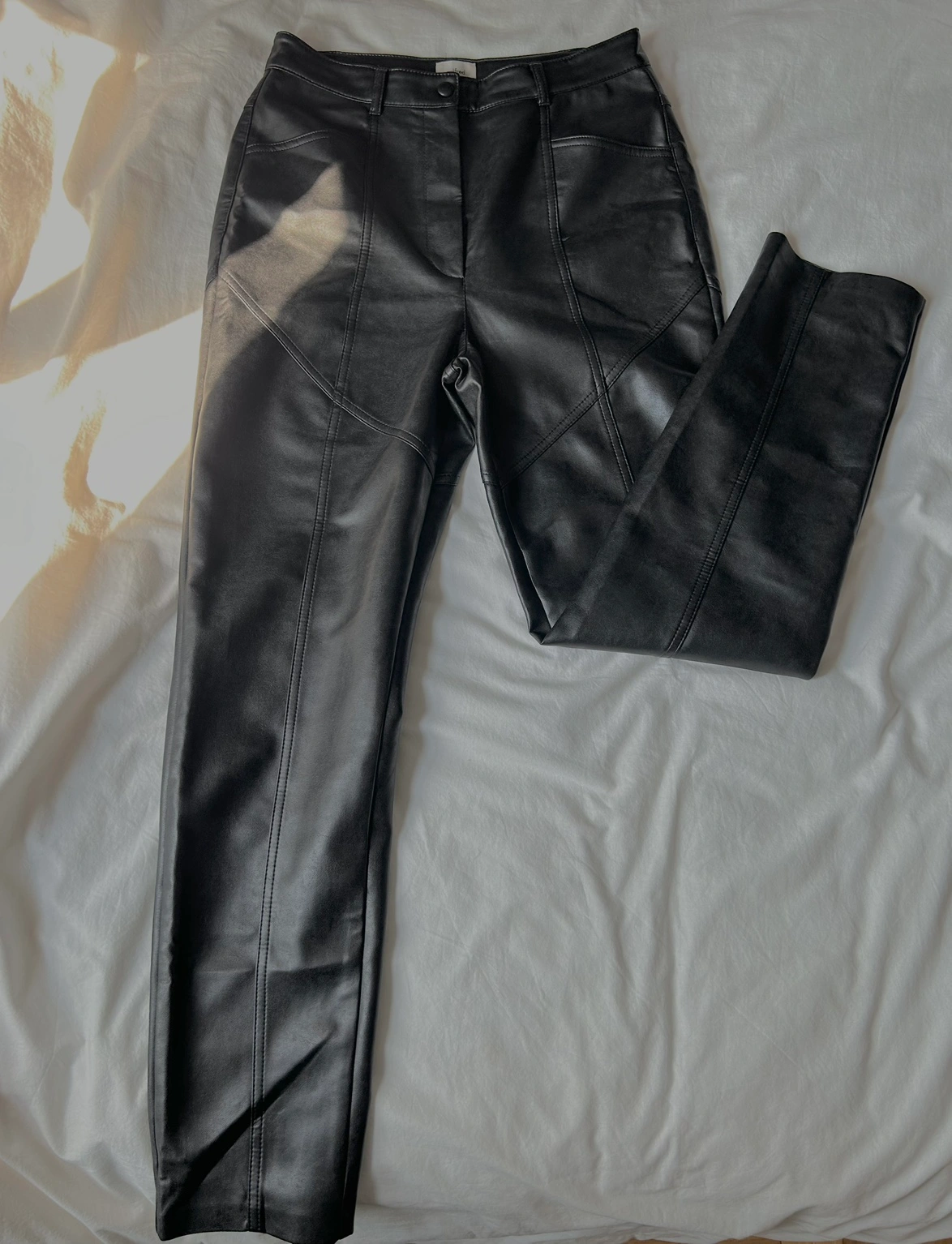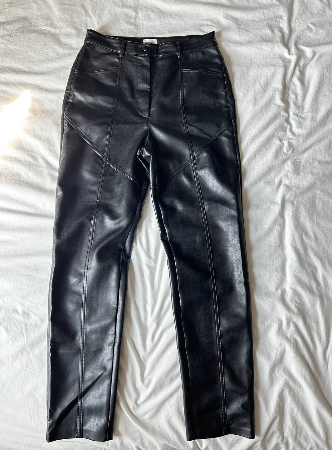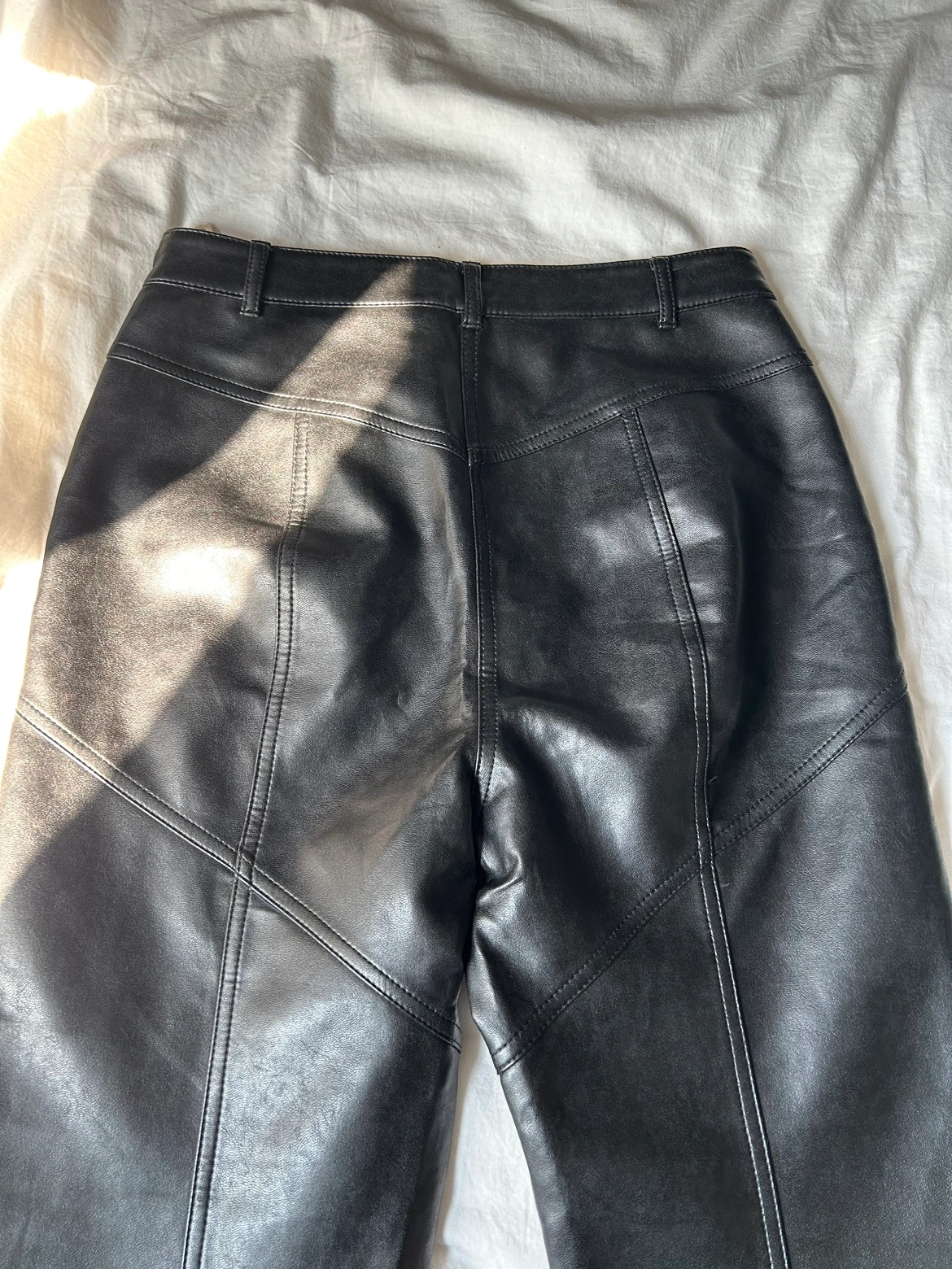 Straight leg pant, seaming & topstitch detailing. Vegan Leather, Amazing quality. Rise: High Fit: Straight leg Length: Full ( 5’3” - 5’7”)